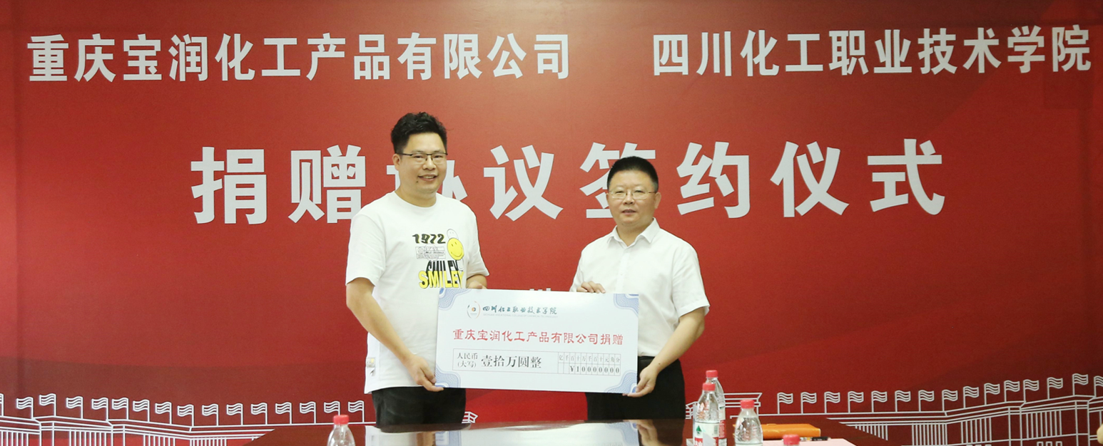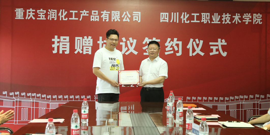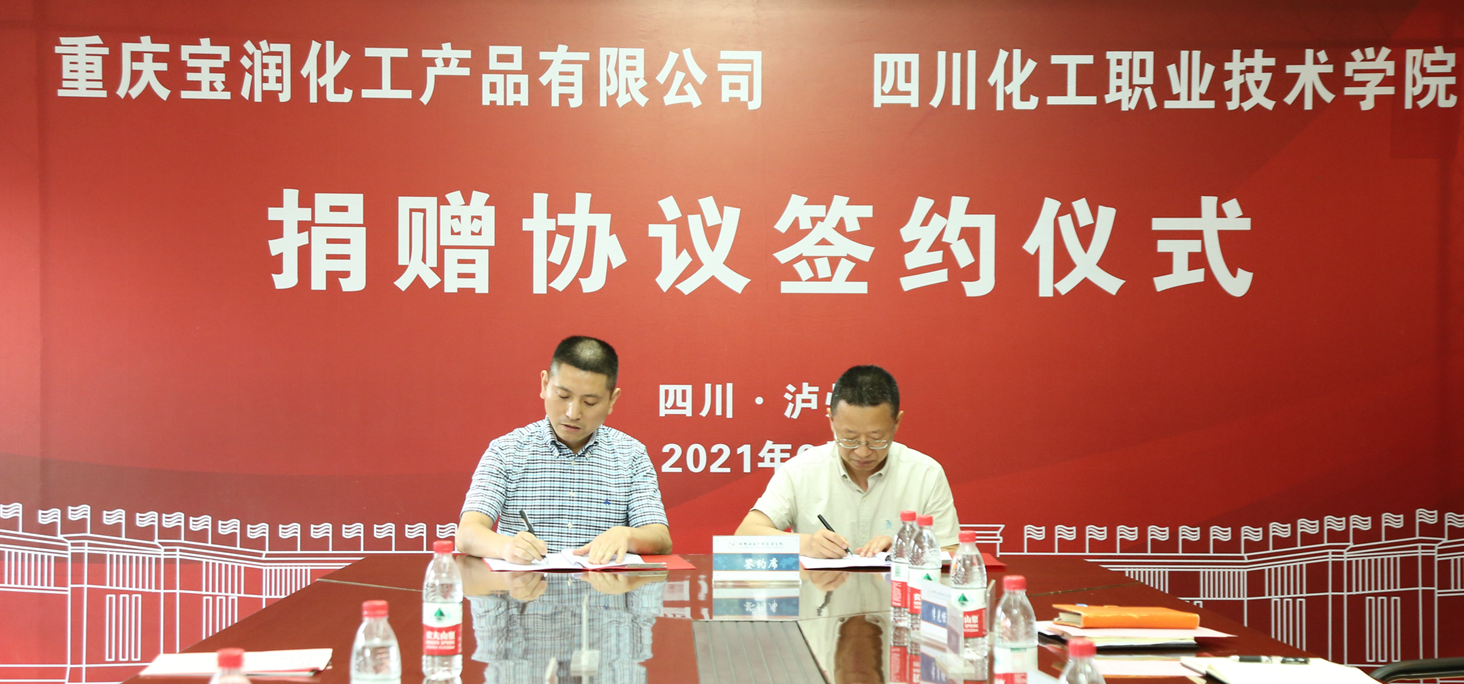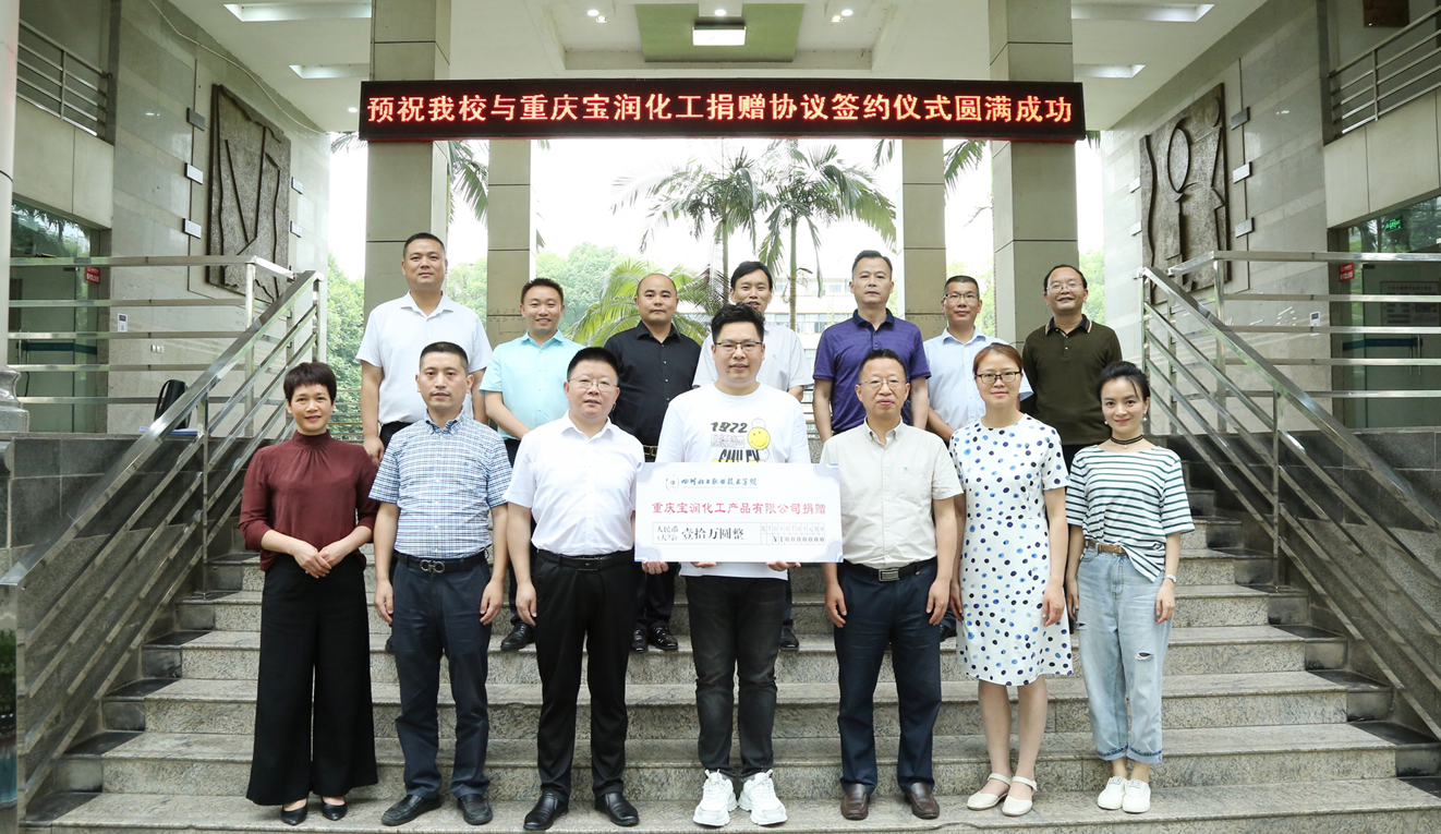 6月2日,学校与重庆宝润化工产品有限公司捐赠签约仪式在行政楼三楼会议室举行。重庆宝润化工产品有限公司董事长、学校99级校友石维胜,公司战略合伙人、执行副总、学校97级校友唐菠,四川鑫源鲜冻食品有限公司总经理、学校99级校友张俊,四川麦田时光影视文化有限公司总经理、学校99级校友黄祖华,泸州斯特普网络科技有限公司总经理、学校98级校友唐宁,学校院长文申柳、副院长蒲开伦参加了捐赠仪式。捐赠仪式由招就处(校企合作办)处长罗伦忠主持。