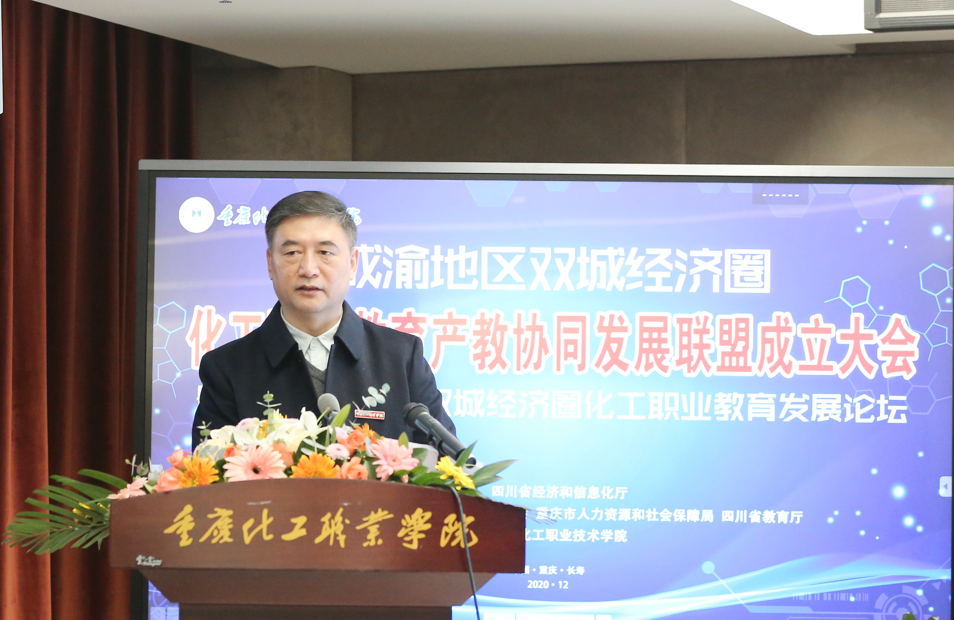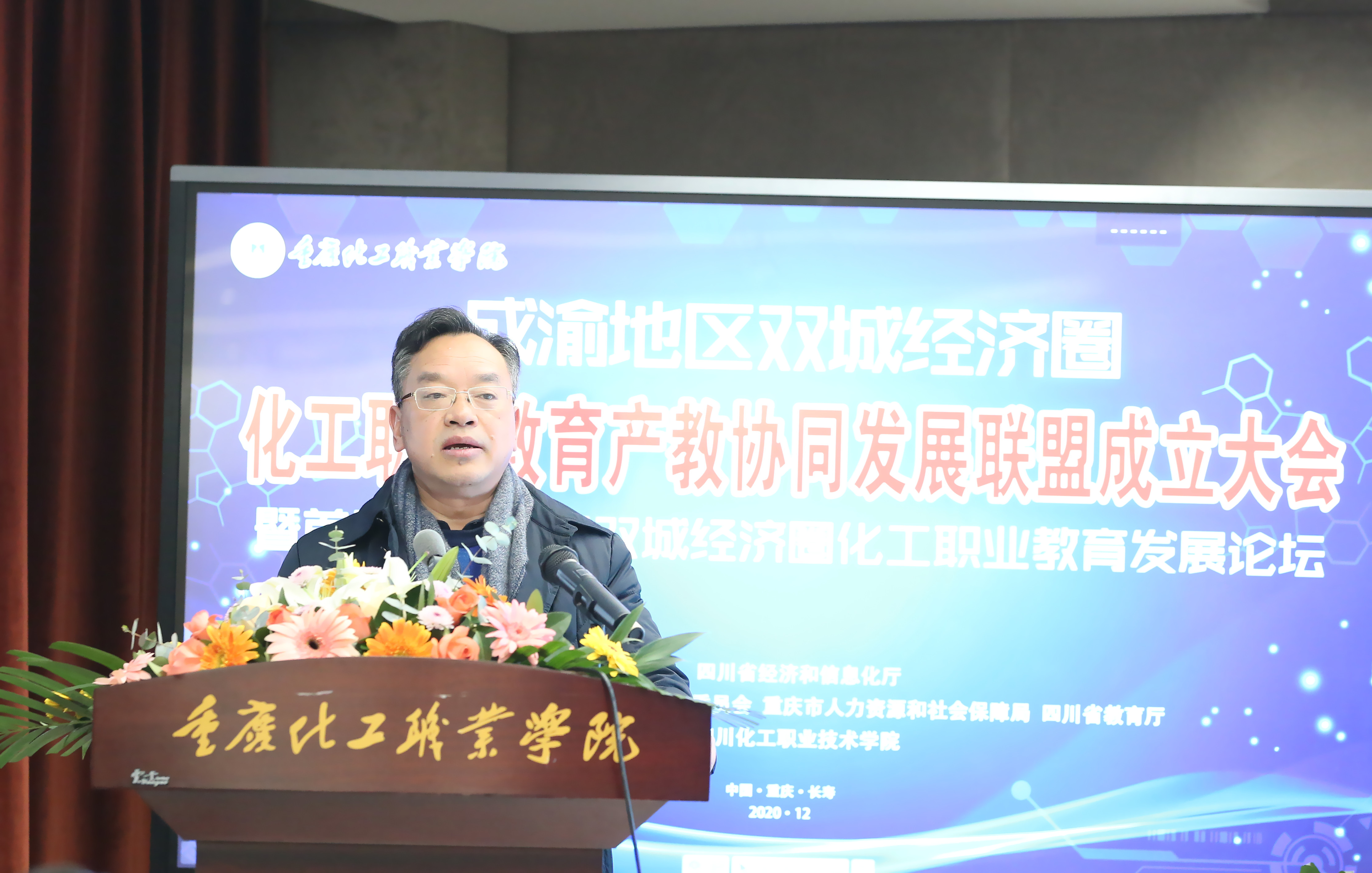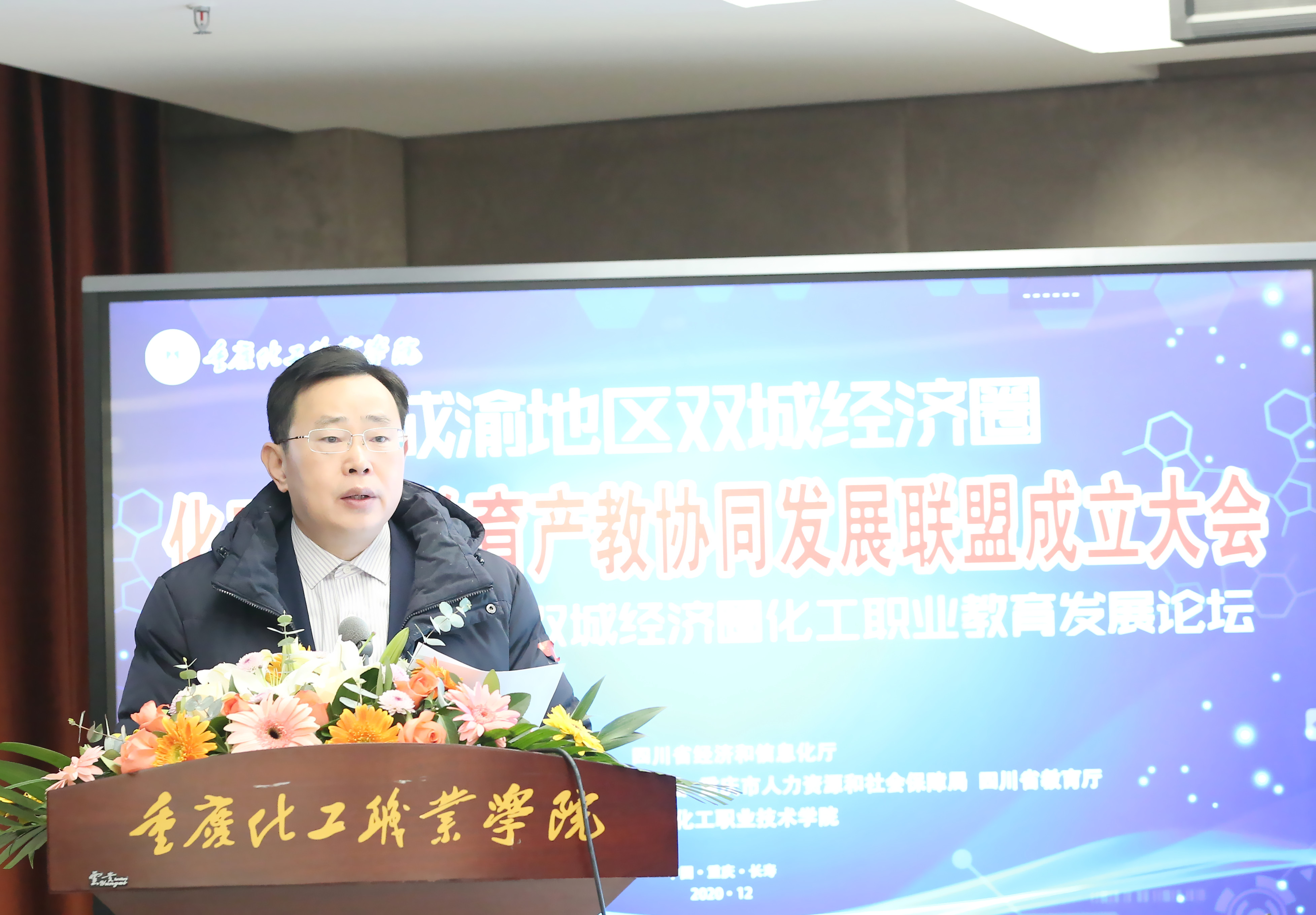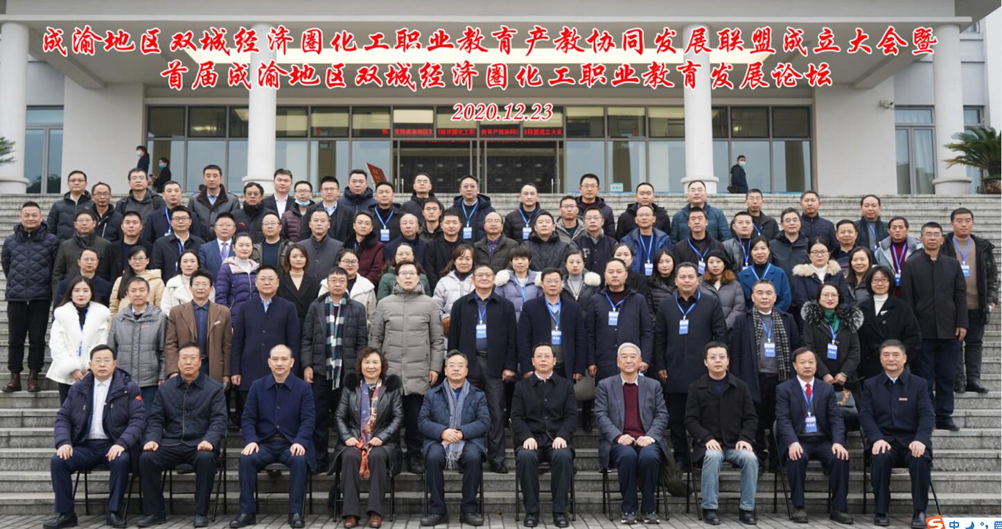 12月23日,由学校与重庆化工职业学院共同发起的成渝地区双城经济圈化工职业教育产教协同发展联盟成立大会暨首届成渝地区双城经济圈化工职业教育发展论坛在重庆化工职业学院隆重举行。重庆市教委副巡视员胡斌、四川省经信厅宣教处处长廖卫民、重庆市人社局职建处一级调研员唐国林、重庆市经信委教培处二级调研员卢军、重庆化医(控股)集团公司副总经理牟天明,重庆化工职业学院党委书记范永同、院长李慧民,学校党委书记刘志勇,党委副书记、纪委书记、工会主席陈淑娟,党委委员、副院长王志斌以及50余家企事业单位、中高职学校的领导及来宾出席成立大会。成立大会分别由重庆化工职业学院副院长张荣,学校党委委员、副院长文申柳主持。