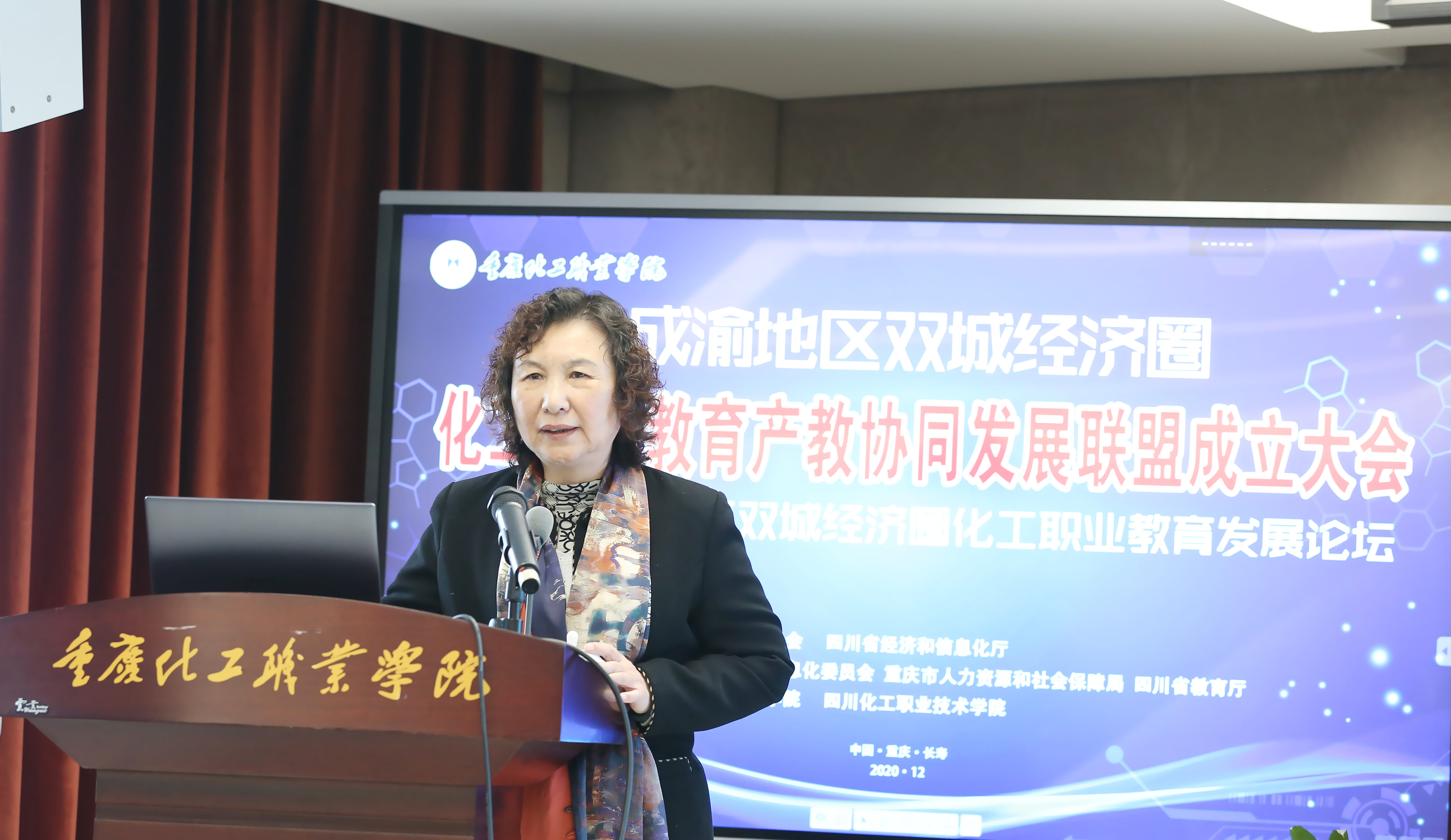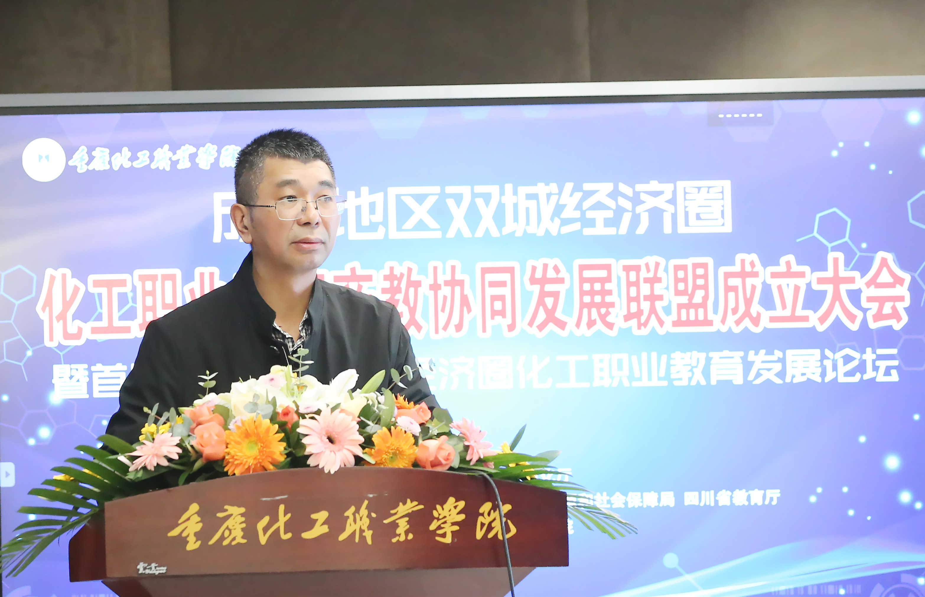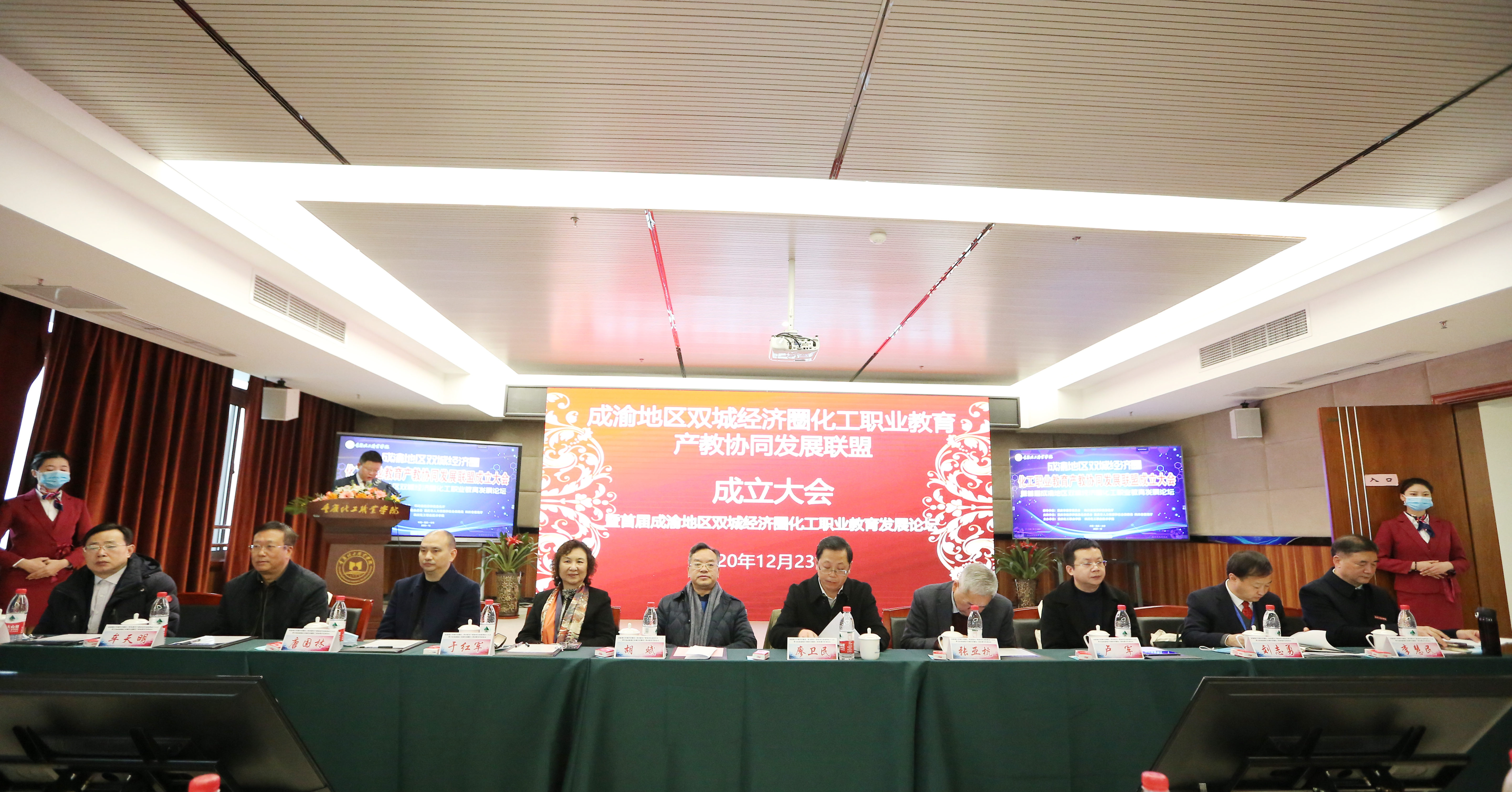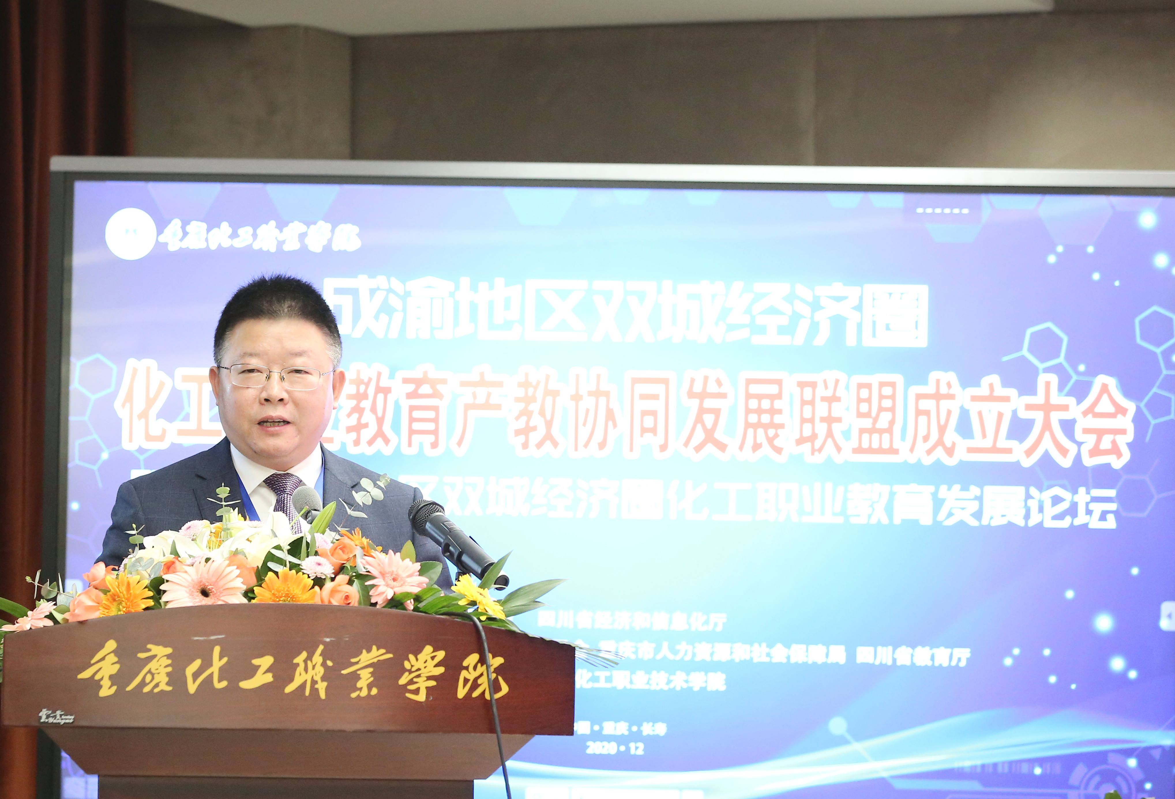 12月23日,由学校与重庆化工职业学院共同发起的成渝地区双城经济圈化工职业教育产教协同发展联盟成立大会暨首届成渝地区双城经济圈化工职业教育发展论坛在重庆化工职业学院隆重举行。重庆市教委副巡视员胡斌、四川省经信厅宣教处处长廖卫民、重庆市人社局职建处一级调研员唐国林、重庆市经信委教培处二级调研员卢军、重庆化医(控股)集团公司副总经理牟天明,重庆化工职业学院党委书记范永同、院长李慧民,学校党委书记刘志勇,党委副书记、纪委书记、工会主席陈淑娟,党委委员、副院长王志斌以及50余家企事业单位、中高职学校的领导及来宾出席成立大会。成立大会分别由重庆化工职业学院副院长张荣,学校党委委员、副院长文申柳主持。