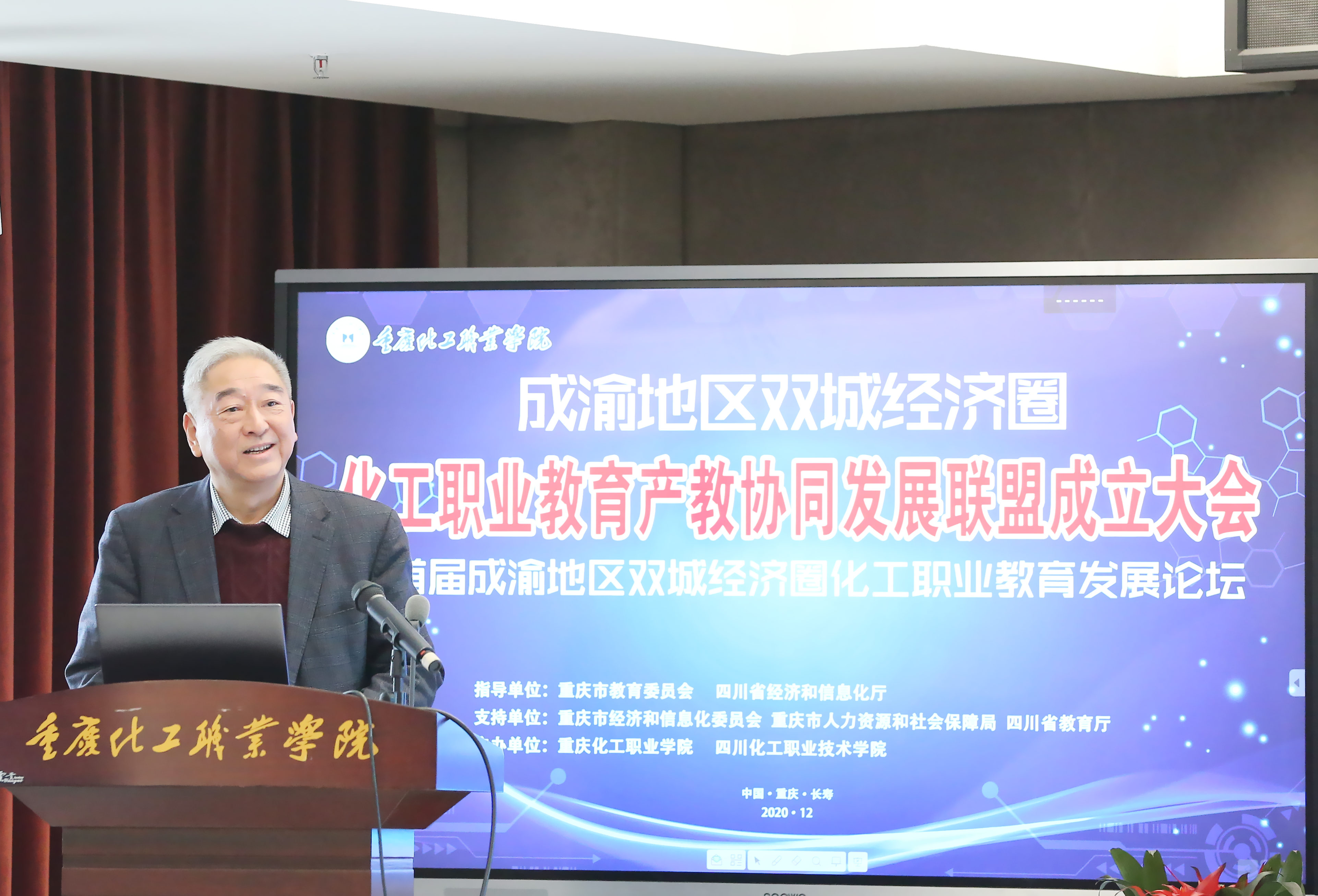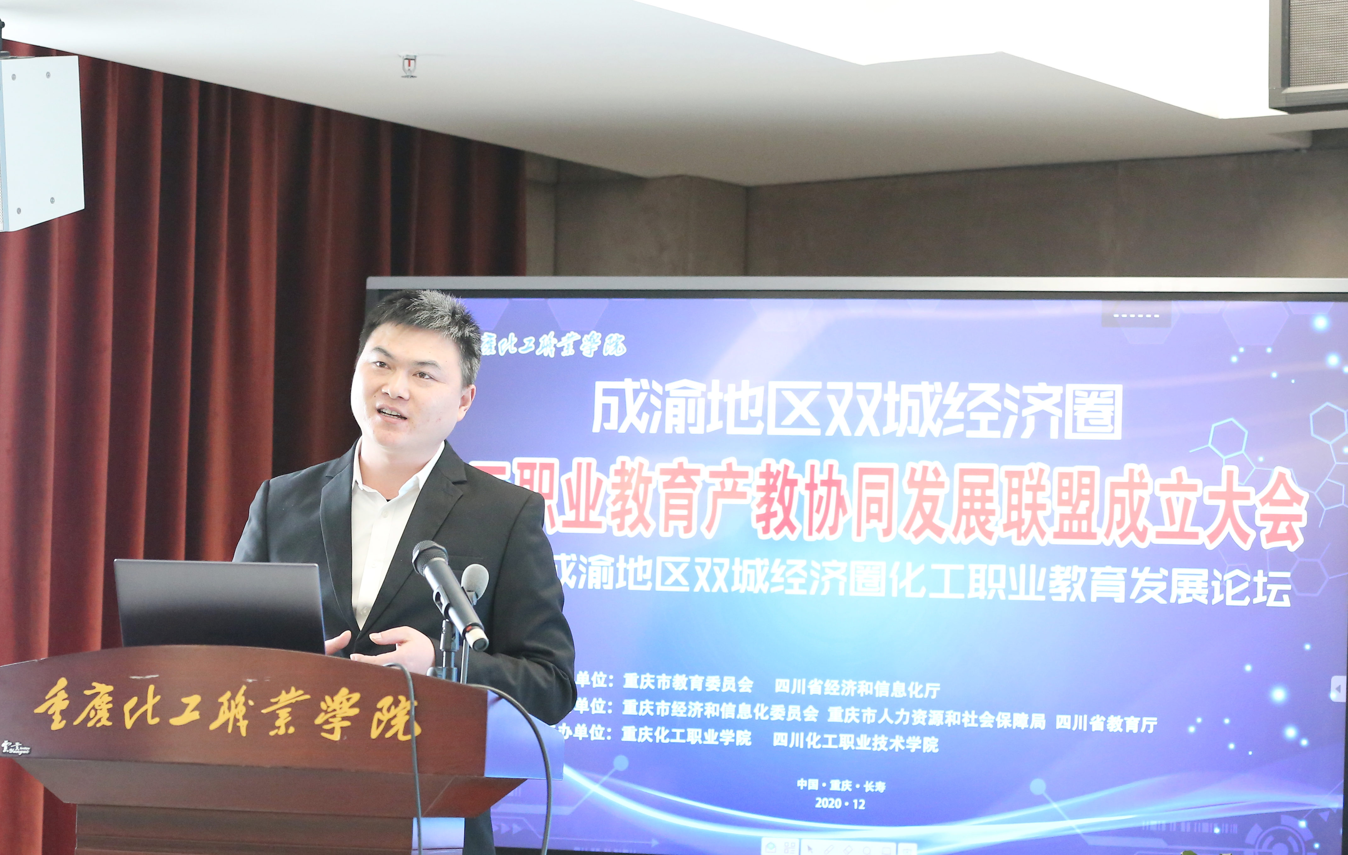 成立大会结束后召开了首届成渝地区双城经济圈化工职业教育发展论坛,论坛邀请了中国化工教育协会驻会副会长于红军,重庆高等职业技术教育研究会会长、国家督学张亚杭,合盛硅业(泸州)有限公司总经理助理程渝峰作专题报告。于红军以《石油和化工发展与职教联盟建设的意义和作用》为题,从石油和化学工业——不可动摇的产业地位、行业发展及智能化迭代——未来已来、石油和化工职业教育——亟待创新、职教联盟建设突破口——产教融合等四个方面,向与会嘉宾进行了深入阐述;张亚杭以《校企合作共赢共生的思考》为题,通过政策依据、基本认识、共赢共生思考三个方面,深入浅出地向大家介绍了如何提升校企合作水平、如何形成校企命运共同体等问题;程渝峰以《有机硅发展历程与公司面临的机遇挑战》为题,从有机硅的发展历程、有机硅产品的应用等方面,介绍了有机硅在人们生活中发挥着不可或缺的作用,对于改变对化工的妖魔化认识起到了积极作用,并就合盛硅业有限公司未来的发展前景进行了介绍。