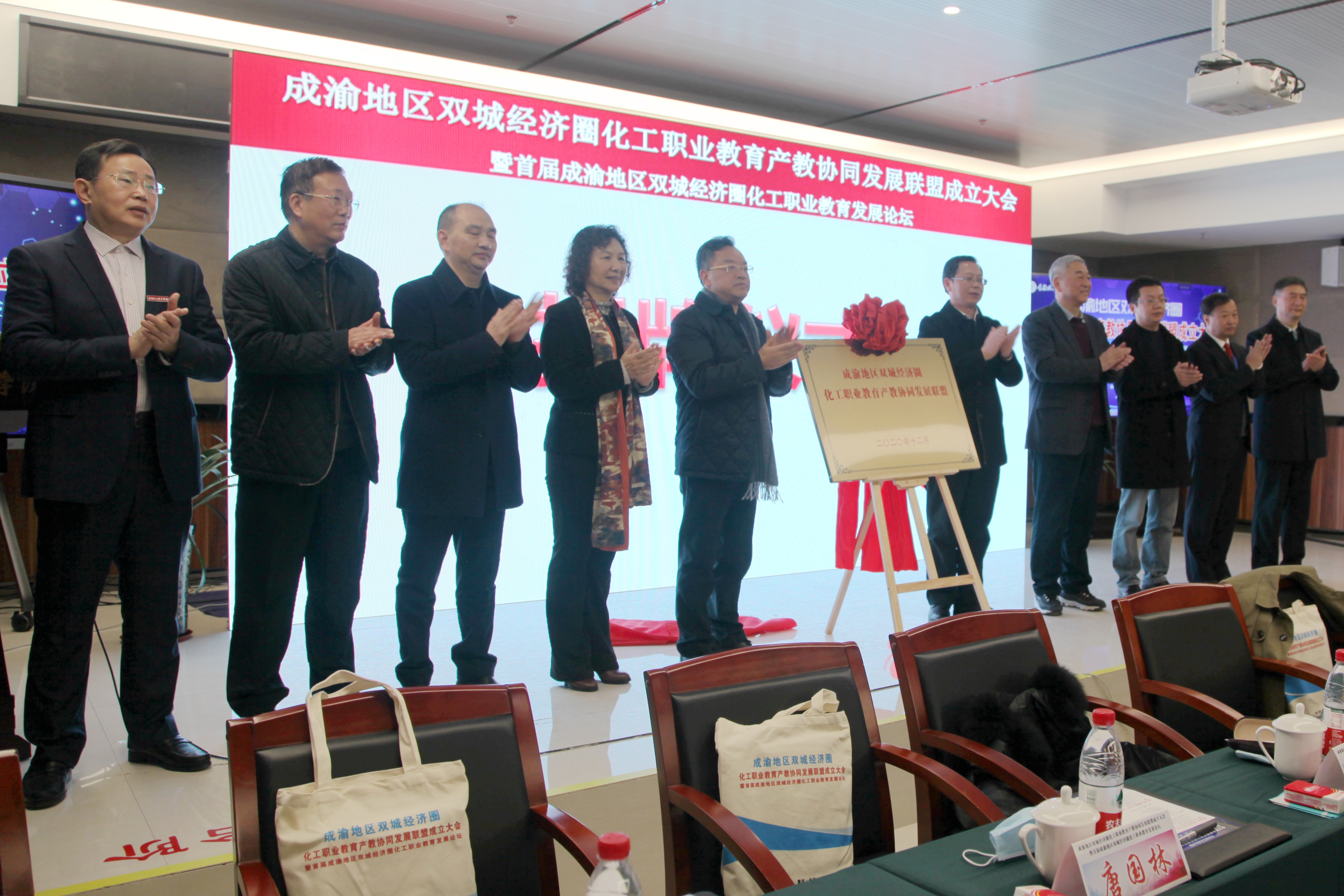 重庆市教委副巡视员胡斌、四川省经信厅宣教处处长廖卫民共同为成渝地区双城经济圈化工职业教育产教协同发展联盟揭牌。