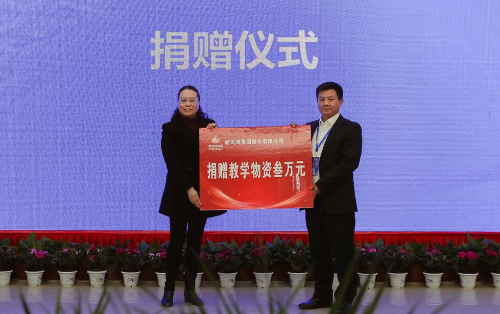 会议上,为感谢学校对企业的人才培养和输送,新凤鸣集团股份有限公司向学校捐赠了价值三万元的教学物资,新凤鸣集团股份有限公司高级人力资源总监宋建红向学校党委副书记、纪委书记、工会主席陈淑娟颁发了捐赠书。