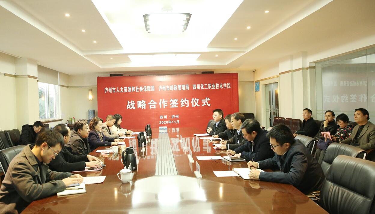 在与会人员的共同见证下,市人社局王平副局长、市邮管局王艳飞局长与学校文申柳副院长共同签署了《泸州市人力资源和社会保障局·泸州市邮管局·四川化工职业技术学院战略合作框架协议书》。