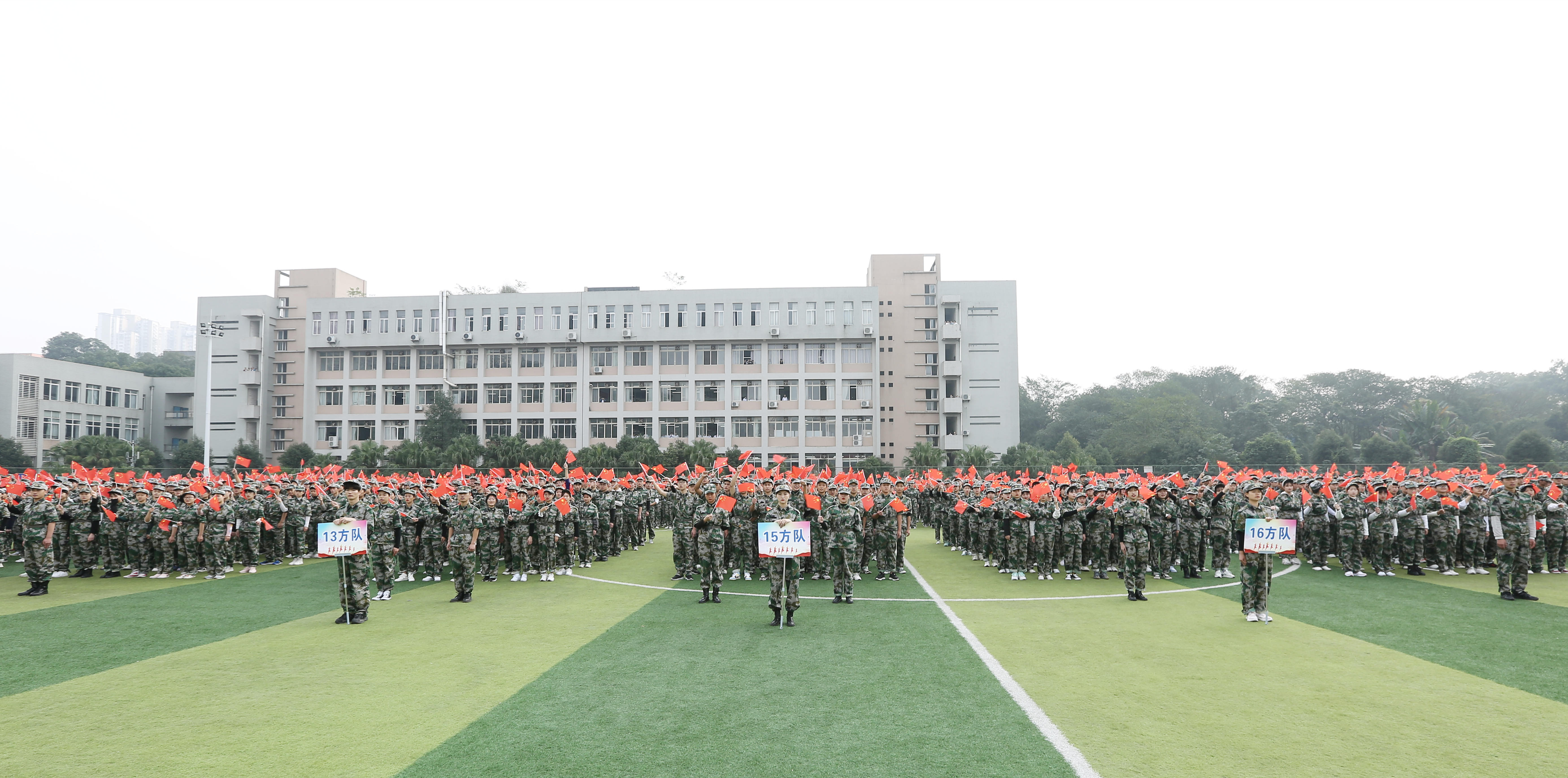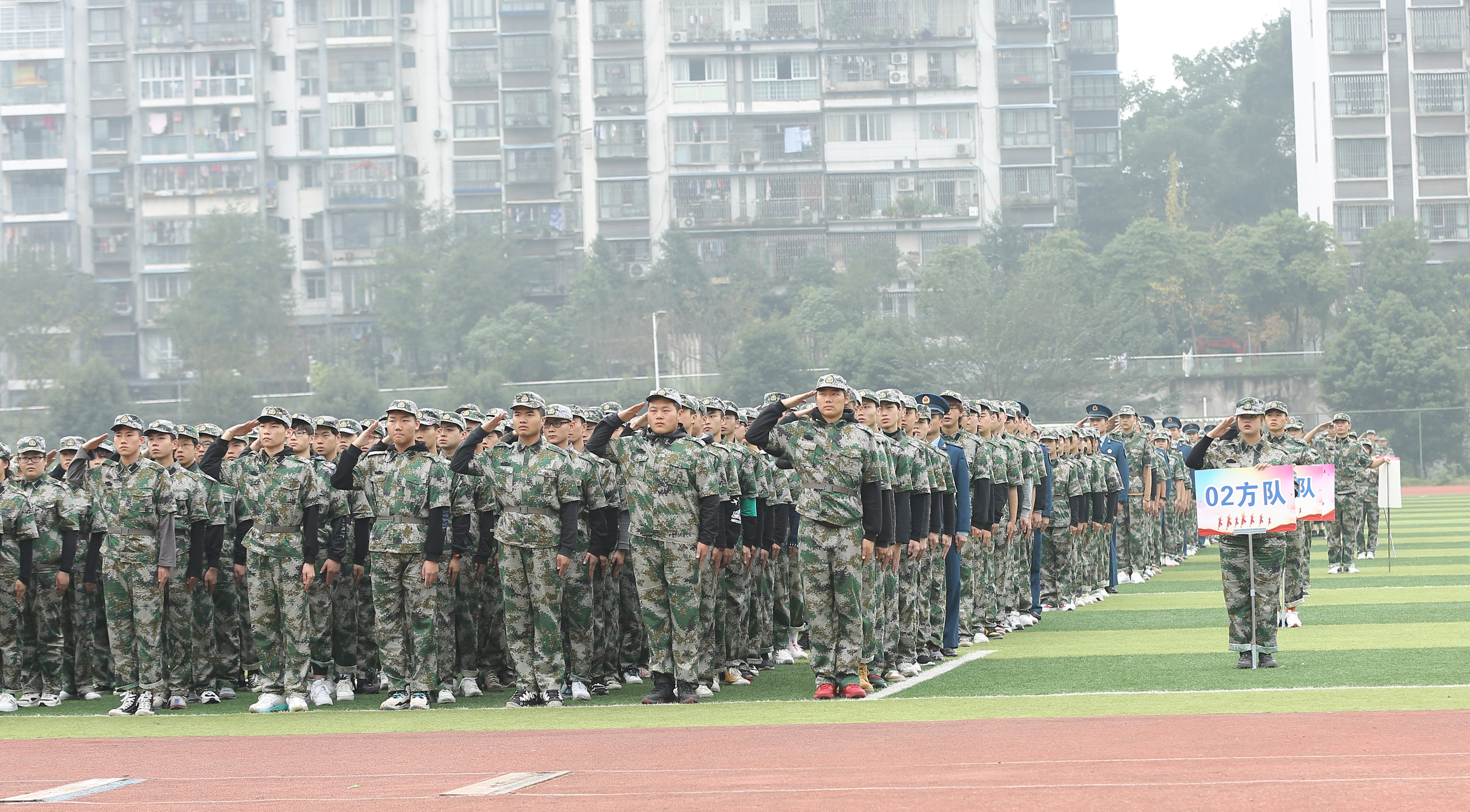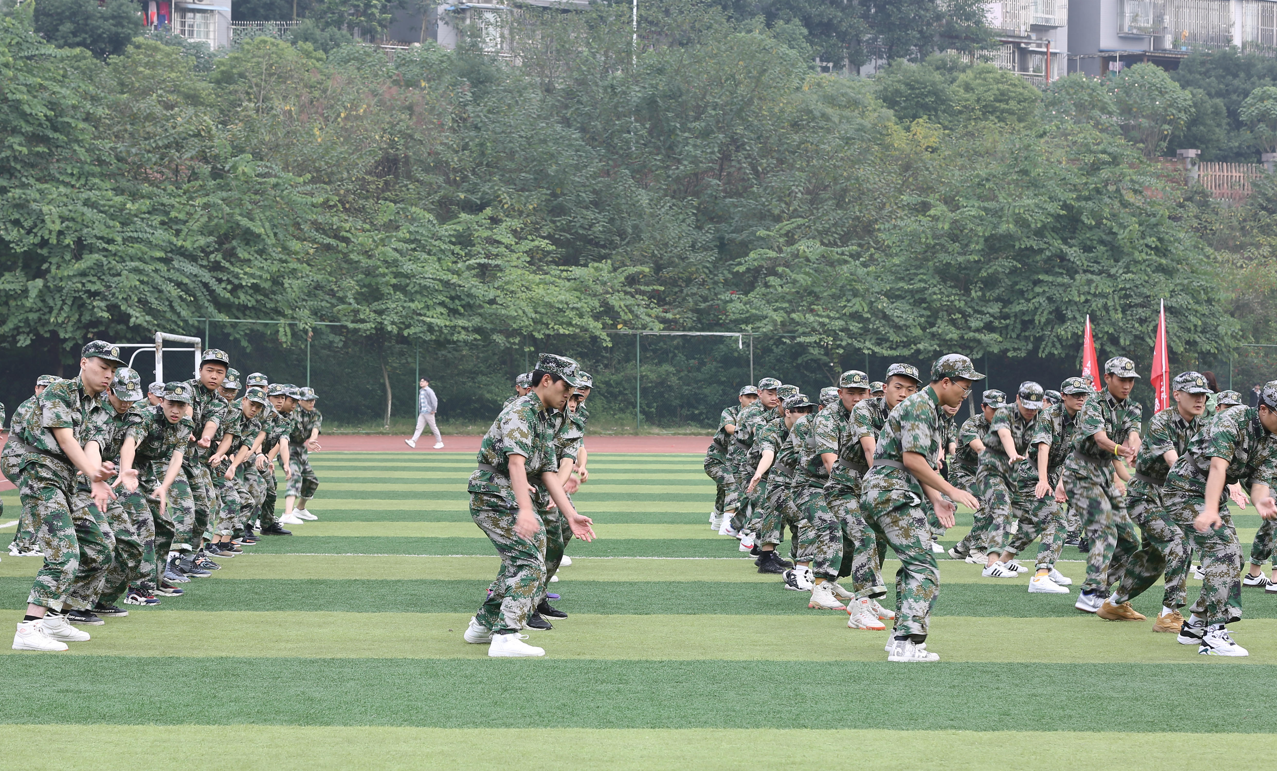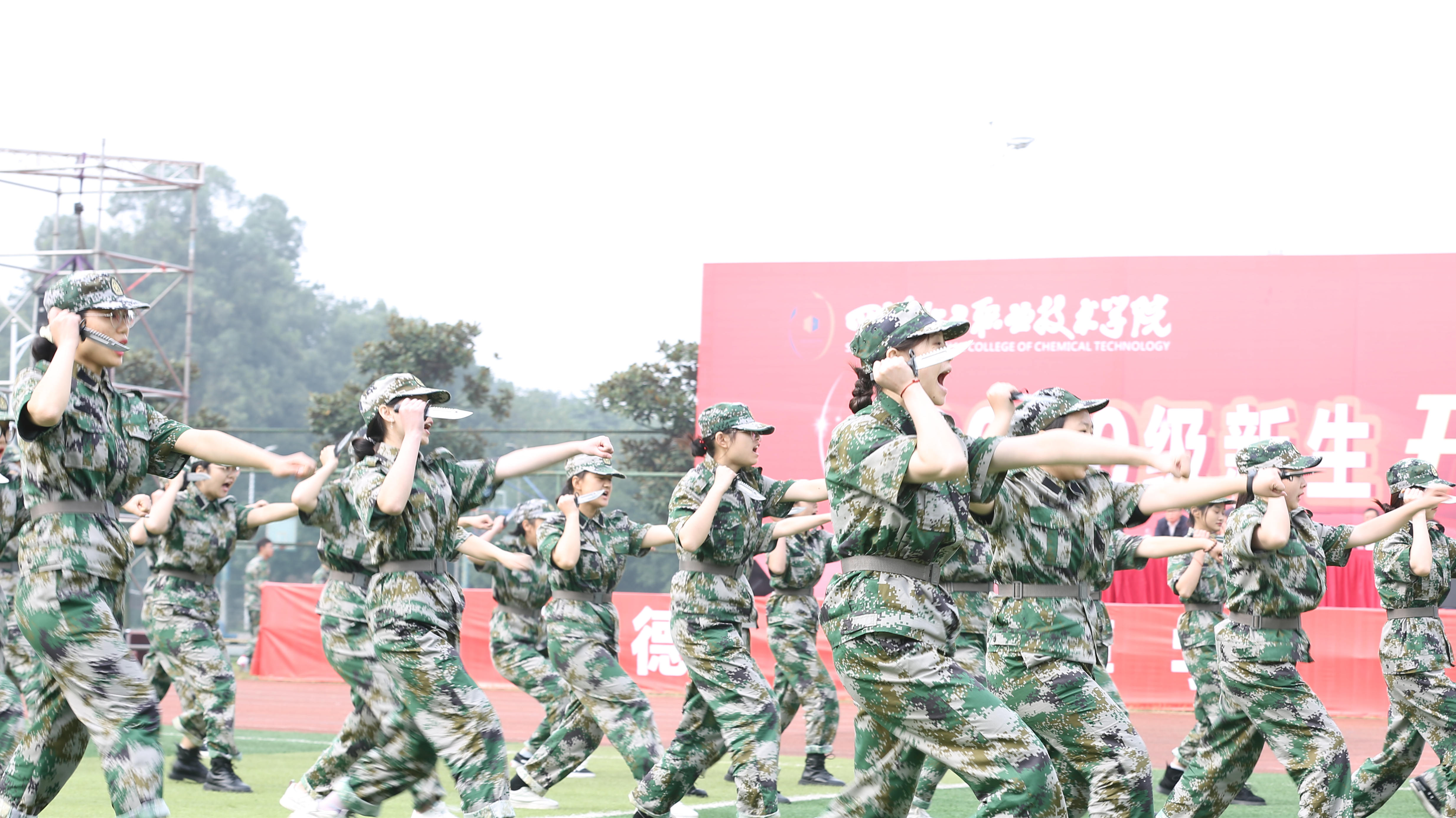 军训成果汇报表演中, 4000余名新生分为33个方队,他们精神抖擞,喊着嘹亮的口号,迈着整齐的步伐,昂首挺胸,依次正步走过主席台,接受检阅。整齐的队伍充满着蓬勃的朝气,坚定的步伐透露着胜利的信心,充分展示了四川化院学子的精神风貌。分列式表演结束后,各二级学院代表方队在教官的带领下分别进行队列会操比拼、军体拳、匕首操表演。表演军体拳的方队,步伐整齐,臂膀和拳头有力,阵势训练有素,尽显阳刚之气;表演匕首操的女生们神采奕奕、身形矫健,完美展现了巾帼不让须眉的精神面貌。