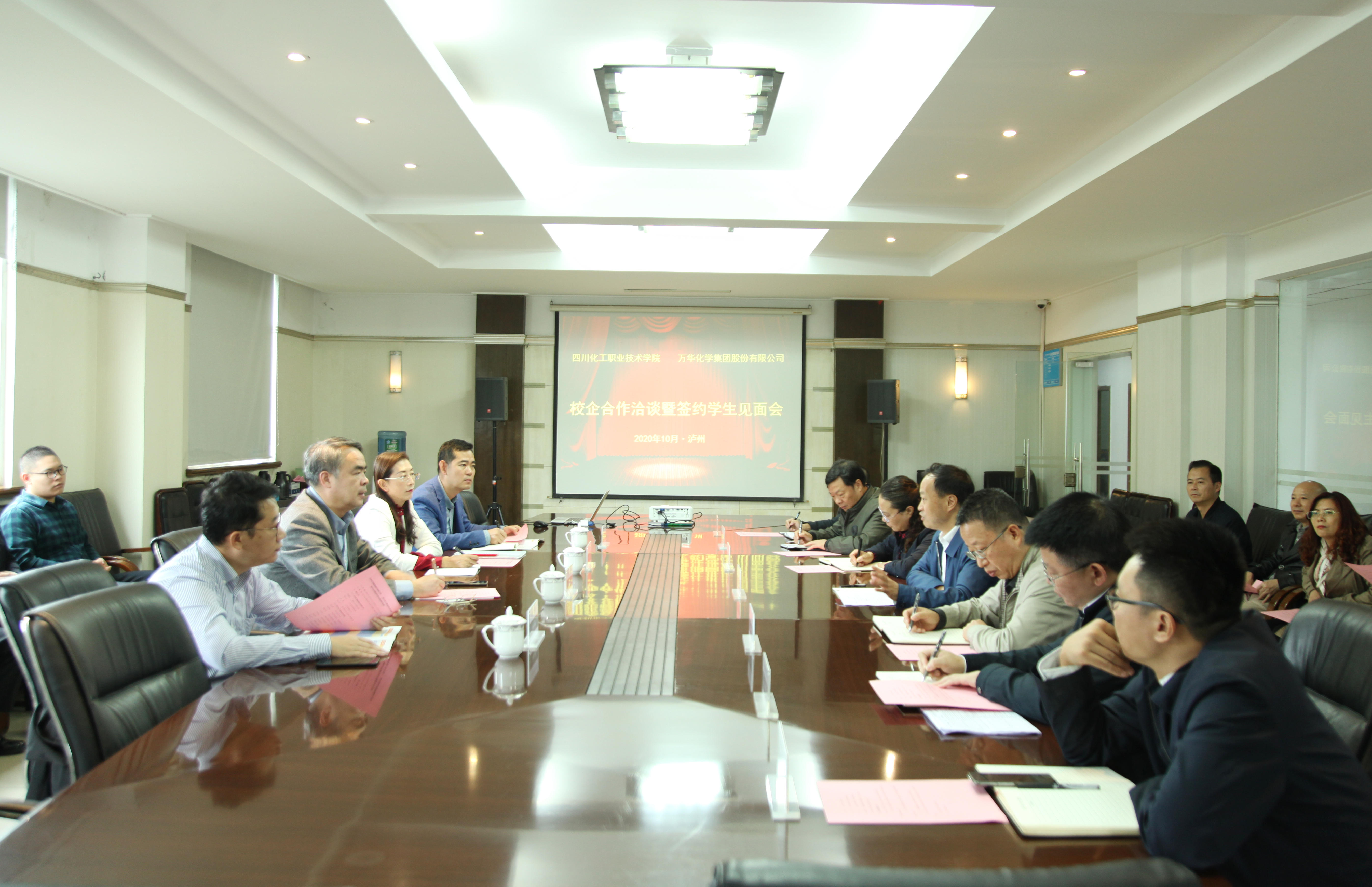 10月11日,全球化工32强、中国500强企业万华化学集团股份有限公司高级人力资源总监赵继德一行来校开展校企合作洽谈,并与成功签约万华化学集团的学校2021届应届毕业生举行见面会。学校党委书记刘志勇,党委副书记、纪委书记、工会主席陈淑娟,党委委员、副院长蒲开伦、王志斌、文申柳,副院长邓启华参加了座谈交流会。