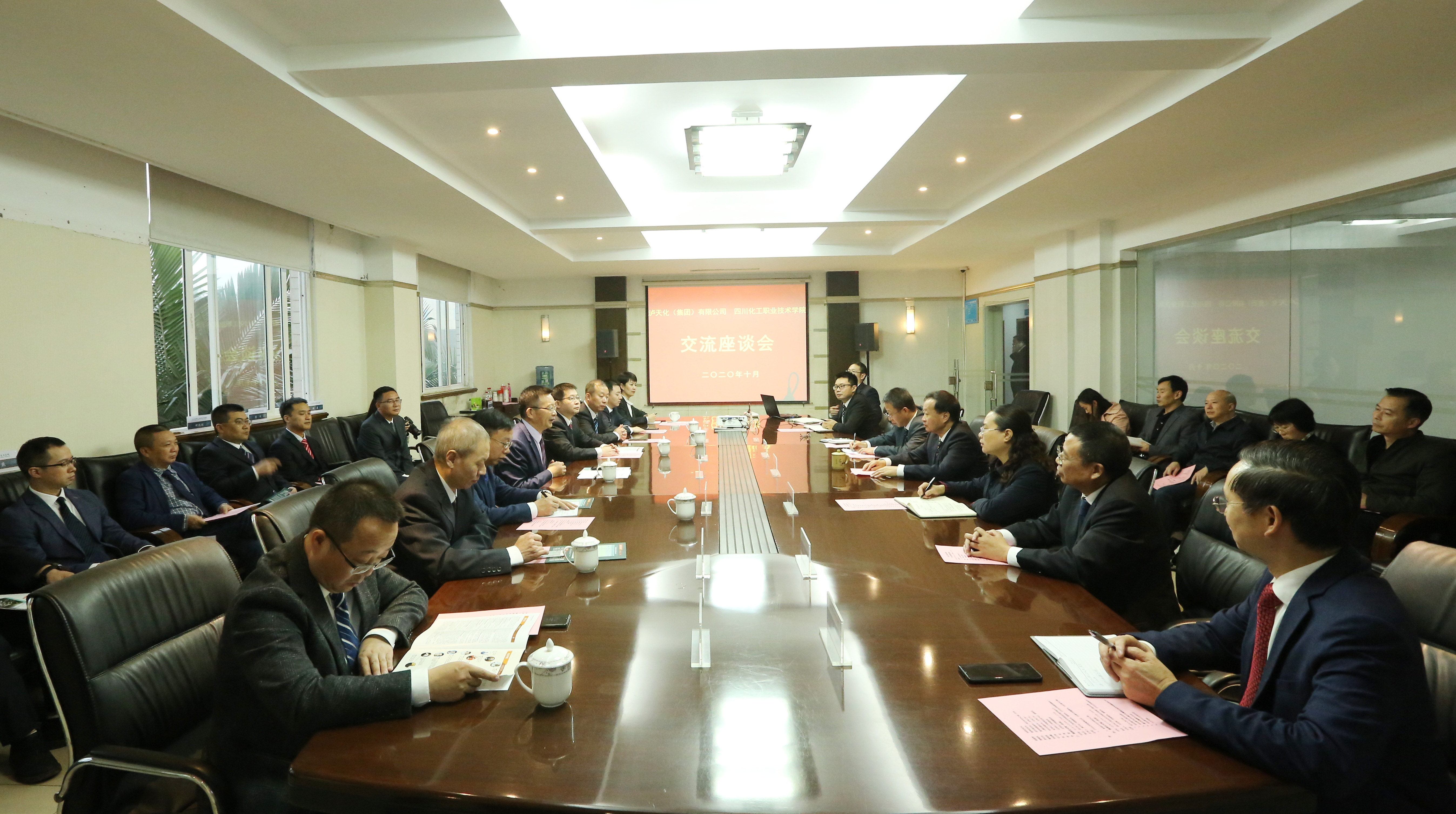 在综合教学楼大厅,谭光军与刘志勇共同为泸天化学院揭牌。随后,校企双方在行政楼三楼会议室举行了座谈会。