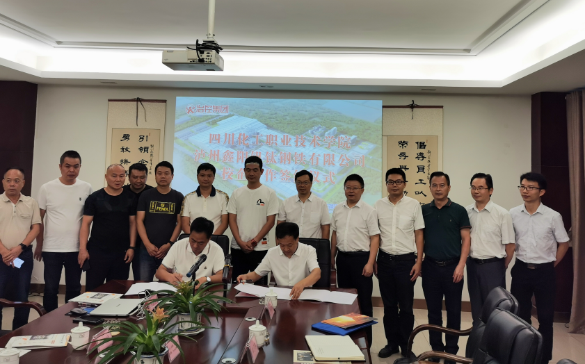2020年9月3日,学校与泸州鑫阳钒钛钢铁有限公司校企合作签约仪式在泸州城坤实业(集团)有限公司(泸州鑫阳钒钛钢铁公司总部)办公楼二楼会议室隆重举行。泸州鑫阳钒钛钢铁有限公司刘义腾董事长、李奎总经理、刘义峰副董事长、林仰彬常务副总经理、黄天明副总经理、陈瑞峰副总经理、陈香莺副总经理,学校党委书记刘志勇, 校党委委员、副院长王志斌、文申柳参加签约仪式。签约仪式由泸州鑫阳钒钛钢铁有限公司总经理李奎主持。