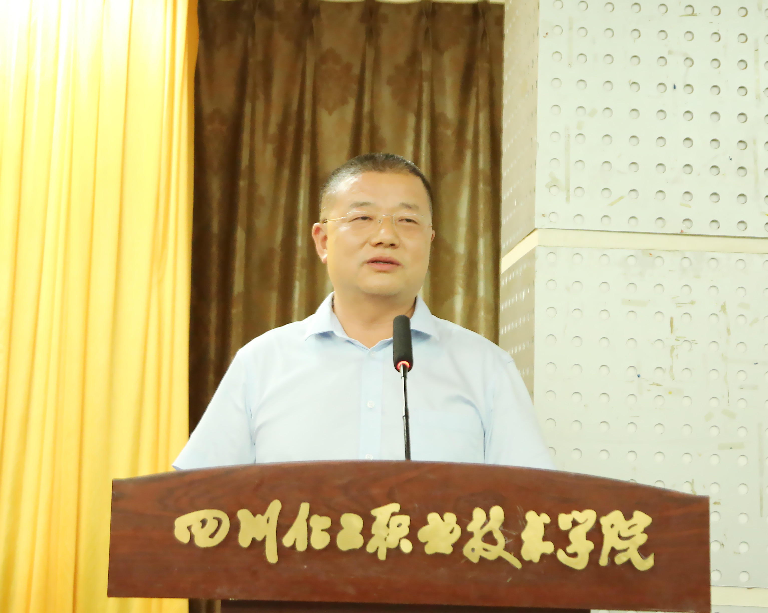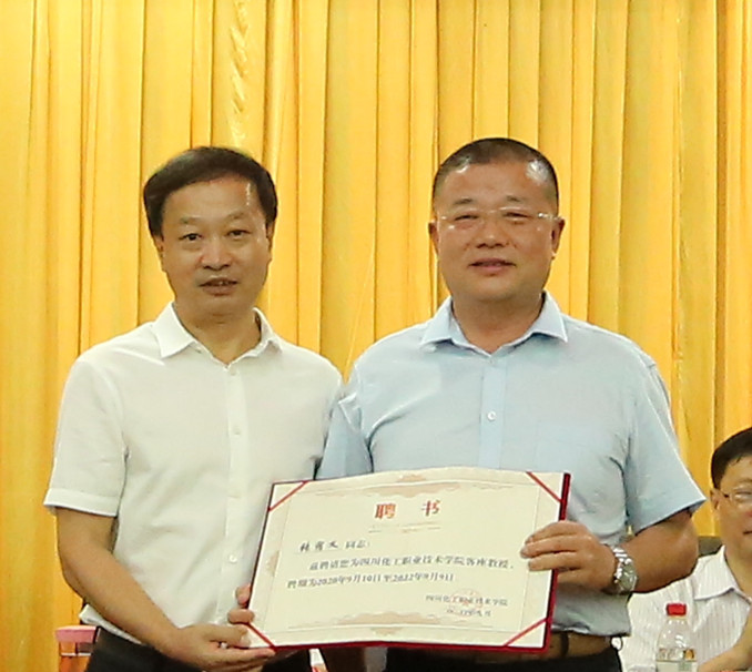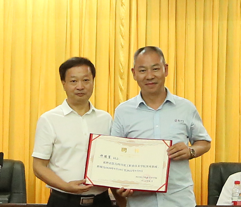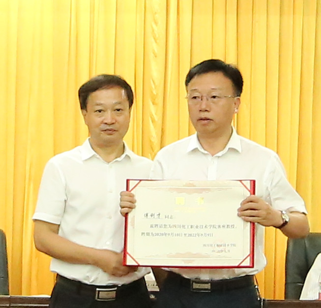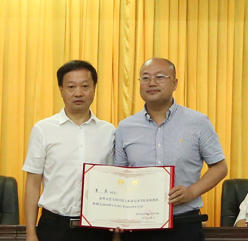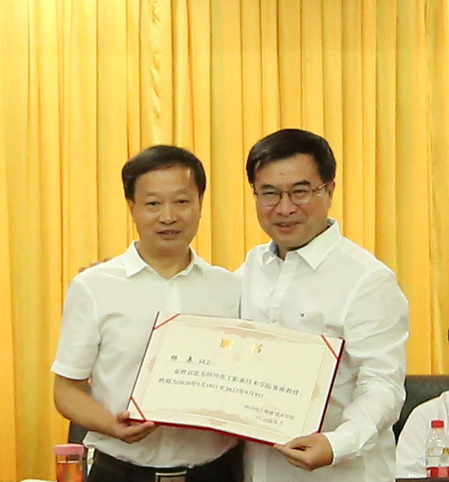 客座教授代表泸州老窖股份公司副总经理张宿义大师发言,表示客座教师责任重大、使命光荣,要发挥好自身专业特长,尽全力服务学校学科建设、教学工作、人才培养,为化职院发展贡献力量。