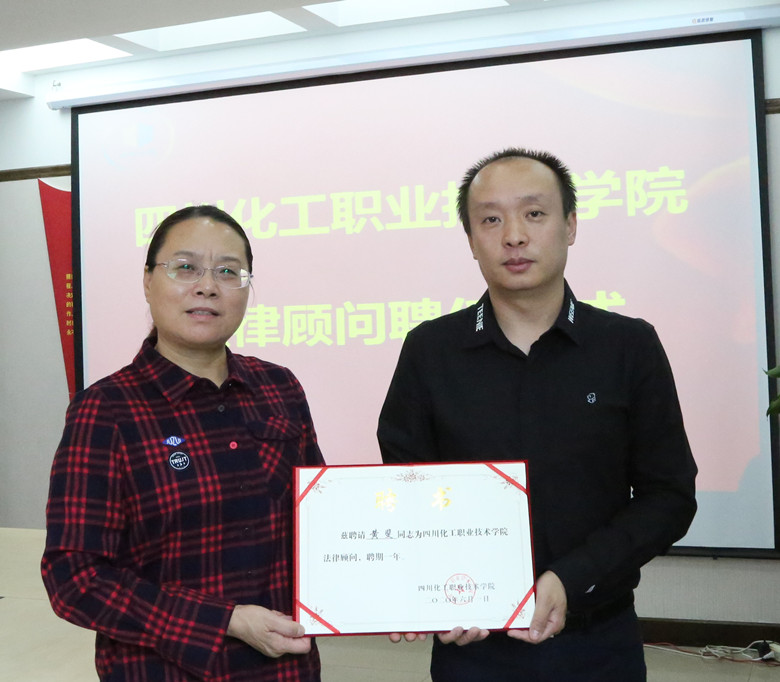 会上,陈淑娟副书记向四川泸杰律师事务所黄斐律师颁发了学院法律顾问的聘书。她指出,聘请法律顾问是构建现代大学制度的重要组成部分之一,对进一步规范学院办学行为、保障学院和师生合法权益、防范和化解法律风险等具有重要的现实意义。同时,她对黄斐律师受聘担任学院法律顾问表示祝贺,并对他一直以来协助处理学院涉法事务所做的工作表示感谢!