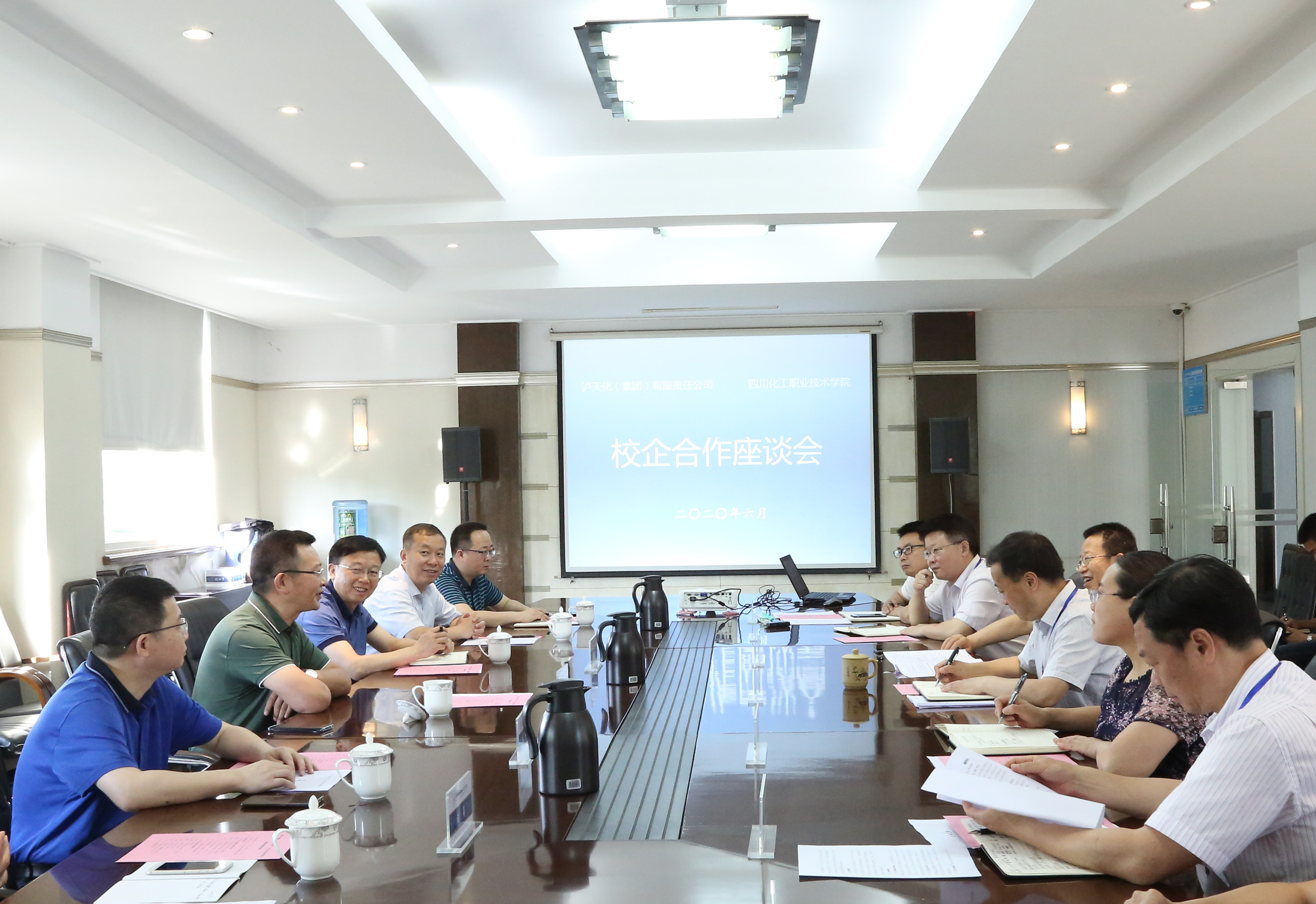 6月5日下午,泸天化集团公司党委书记、董事长谭光军一行6人到学院调研座谈,共商校企合作事宜。学校党委书记刘志勇,党委副书记、纪委书记、工会主席陈淑娟,党委委员、副院长蒲开伦、王志斌、文申柳参加调研座谈会。