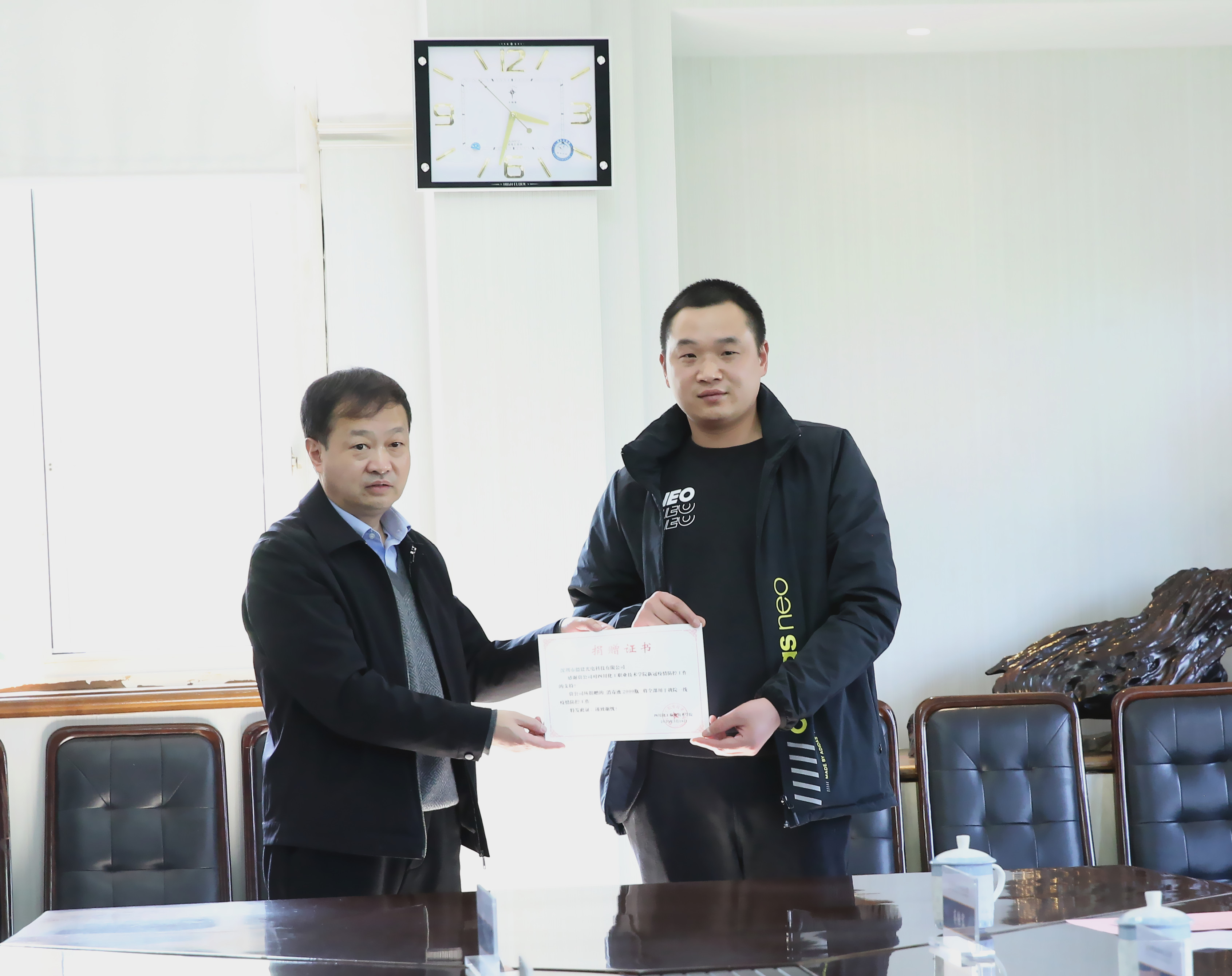 捐赠仪式上,学院党委书记刘志勇代表学院向爱心企业泸州斯特普网络科技有限公司、四川麦田时光影视文化有限公司、四川三思德科技有限公司、四川动动幺科技有限公司、深圳市德建光电有限公司及各位校友代表颁发了捐赠证书。