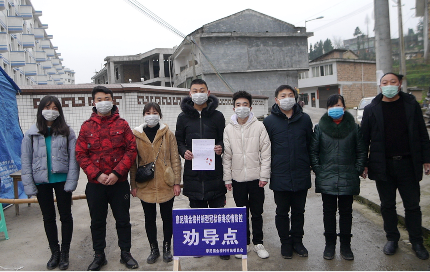 “我来想办法”,当天下午牟均就联系泸州市益生励志协会向村上捐赠消毒液200斤、含氯消毒片200瓶、消毒酒精25L、方便面40件、暖宝宝贴2000片。同时,发挥基层党支部战斗堡垒和党员先锋模范作用,号召党员、返乡大学生、退役军人、群众代表积极参与疫情防控工作,并成立金榜村抗疫青年志愿者突击队。