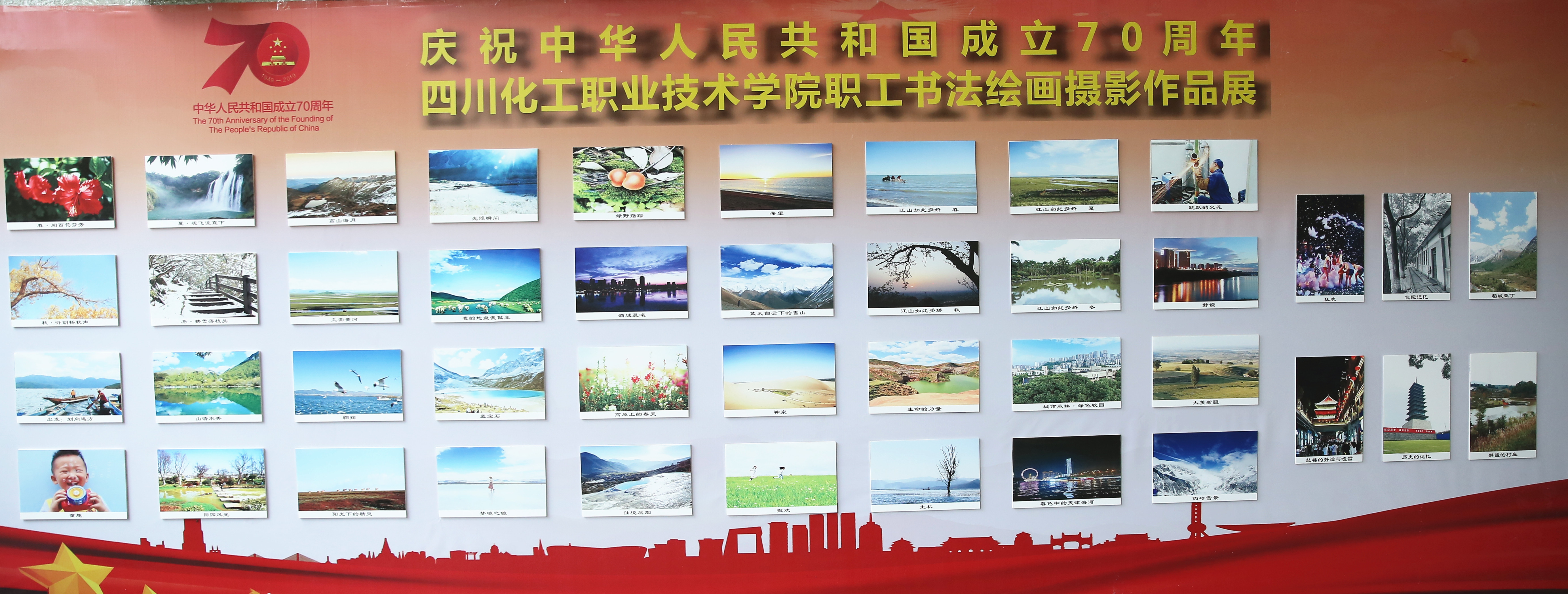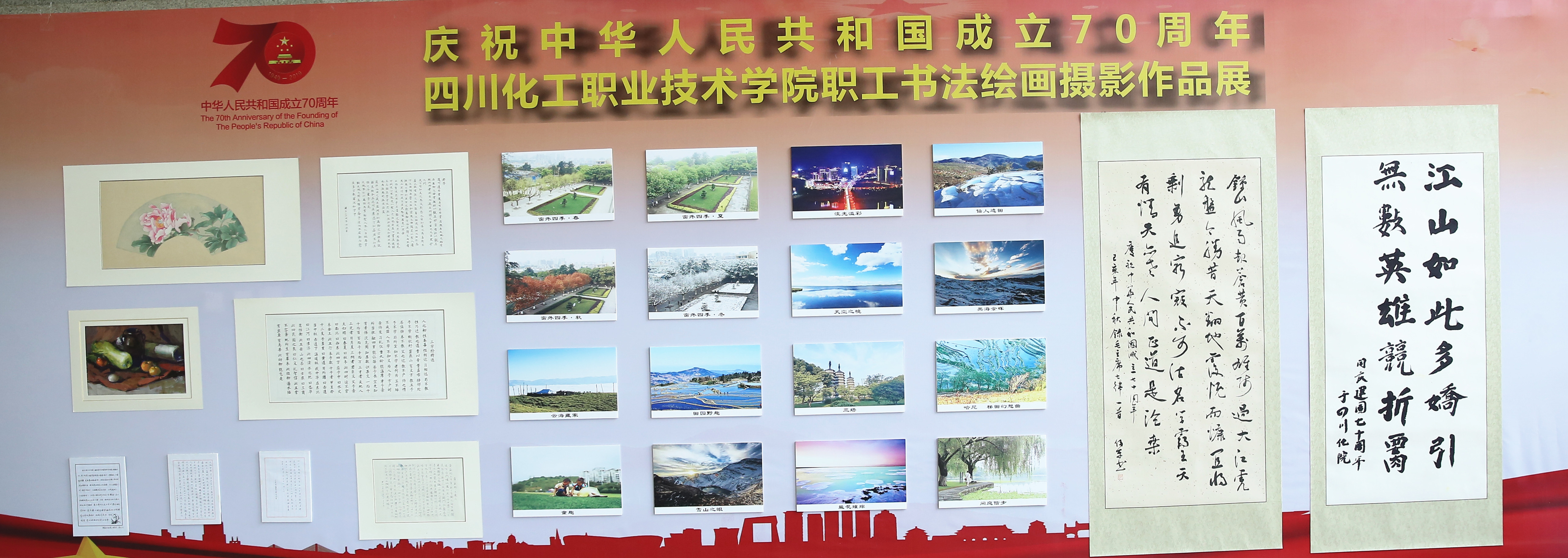 今年是中华人民共和国成立 70 周年,为全方位、多角度、深层次展示新中国 70 年来翻天覆地的变化,学院工会举办了“与共和国同成长·与新时代齐奋进”书法绘画摄影作品展。