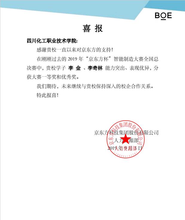 京东方科技集团于2019年8月21日在安徽省合肥市举行全国总决赛,来自全国各地高校30余名顶尖选手进行了最终的角逐,经过激烈竞争,我院机械工程系汽车电子技术1731班李金同学荣获全国总决赛第一名、汽车营销1731班李奇林同学荣获全国总决赛优秀奖、学院在本次大赛中获得一等奖。