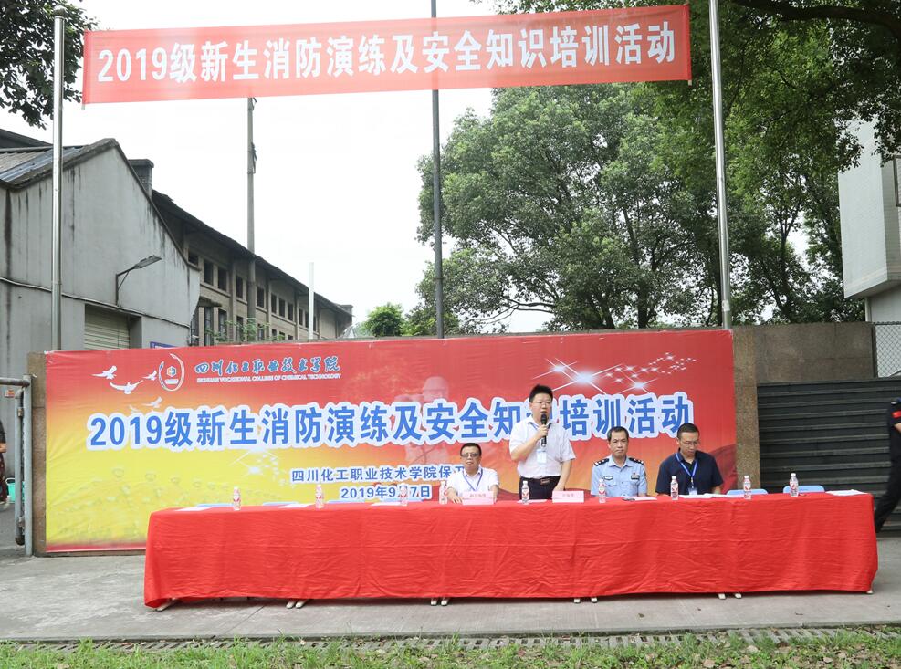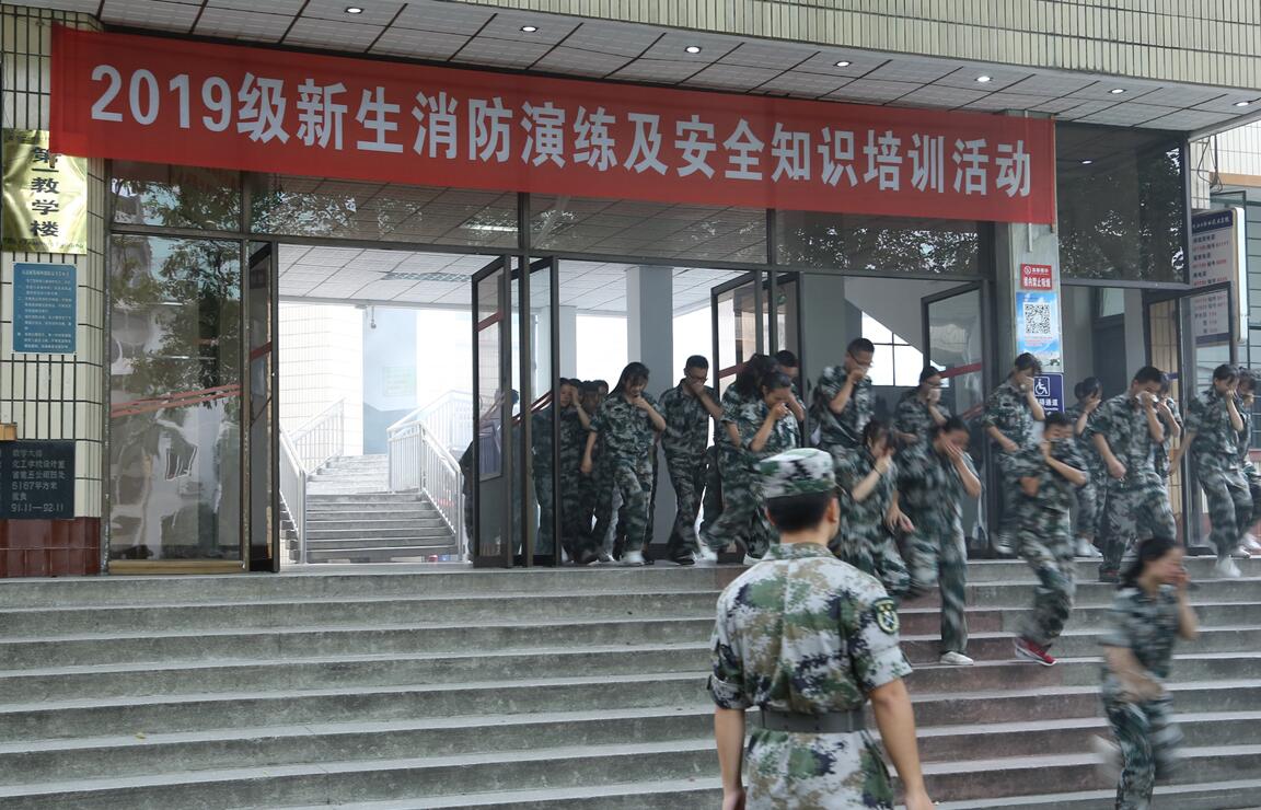 2019年9月7日上午10时,学院保卫处牵头组织开展了2019年新生消防演练及安全知识培训活动。泸州市消防一大队二中队消防官兵和泸州七进消防安全宣传中心教官来我院指导演练,学院文申柳副院长、邓启华院长助理,学生处、团委、后勤服务处、党委办公室、学院办公室、各系等相关部门负责人及师生员工近2000余人参加了演练。