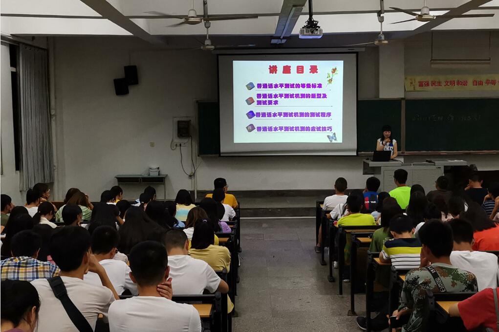 为全面做好今年9月的推普周宣传活动,同时,配合9月中旬泸州市语委举办的普通话水平测试,近日,按照省教育厅的要求,基础部安排四川省普通话水平测试员、人文教研室主任程琴副教授,在实A108教室为全院师生举办了“普通话水平测试机测的应试技巧”讲座,为我院报考普通话水平测试的师生提供了一次考前培训,同时也起到了推广普通话的作用。