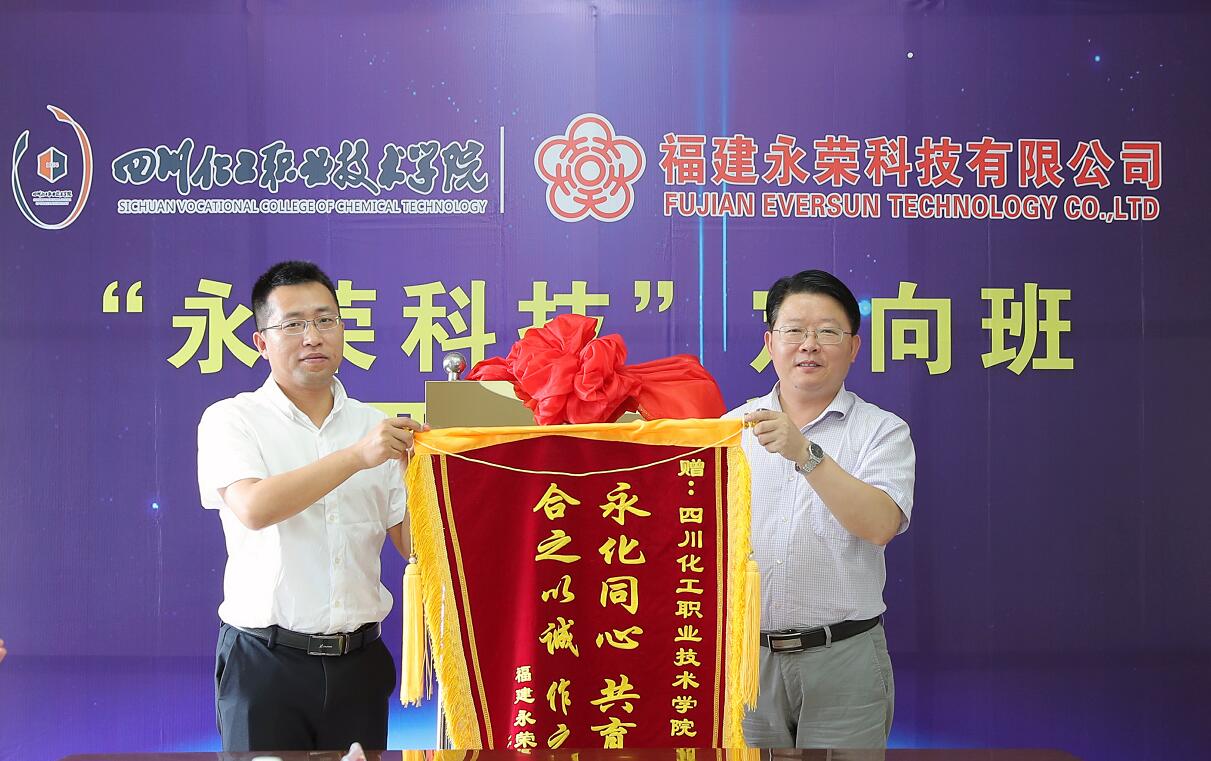 仪式最后,福建永荣科技有限公司副总经理杨微先生代表公司向文申柳副院长赠送了写着“永化同心共育英才 合之以诚作之共荣”的锦旗,表达了公司对学院为公司培养和输送了200多名高素质优秀毕业生的感激之情。