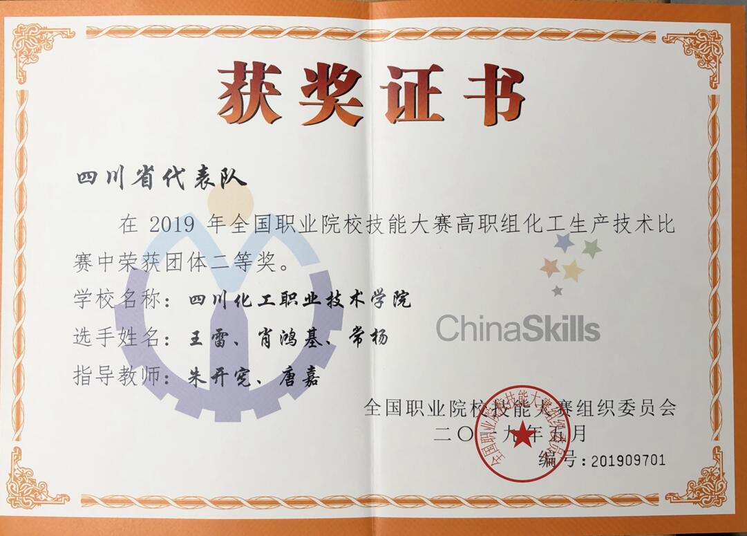 5月13日至17日,由教育部主办的2019年全国职业院校技能大赛(高职组)化工生产技术赛项在广东轻工职业技术学院举行。共有来自全国27个省、直辖市、自治区、计划单列市和新疆生产建设兵团的62个代表队186名选手参加了本次技能大赛。我院石化专业王雷、常杨、应化专业肖鸿基三位同学代表学院参加比赛。经过三天紧张激烈的角逐,我院学生喜获大赛团体二等奖。