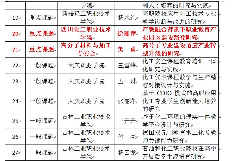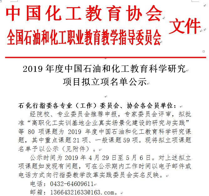 2018年12月,全国石油和化工职业教育教学指导委员会(以下简称石化行指委)工作会议启动了2019年度中国石油和化工教育科学研究项目项目申报工作,2019年1月石化行指委发布立项申报通知(石化行指委〔2019〕1号)及《选题指南》,2019年4月24日石化行指委教学改革实践工作委员会在苏州召开项目评审会议,经院校、专业委员会推荐申报,专家委员会评审,“高职化工实训基地企业真实场景化建设的研究与实践”等80项课题获准立项为2019年度中国石油和化工教育科学研究课题,其中重点课题21项、一般课题59项(见附件1)。我院共有8项课题参加评审,最终有5项课题获准立项,其中重点课题2项,一般课题3项。