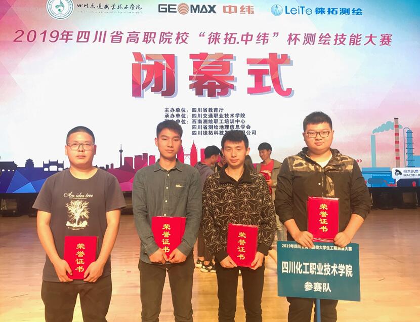 4月18日至20日,由四川省教育厅主办、四川交通职业技术学院承办的2019年四川省高职院校大学生工程测量技能大赛在成都举行。我院信息工程系测绘地理信息技术专业的莫逸轩、王静松、汤铃、陆旭东四位同学组成的参赛团队,在卢燚、杨鑫两位老师的指导下,荣获了1:500数字测图二等奖和二等水准测量三等奖。