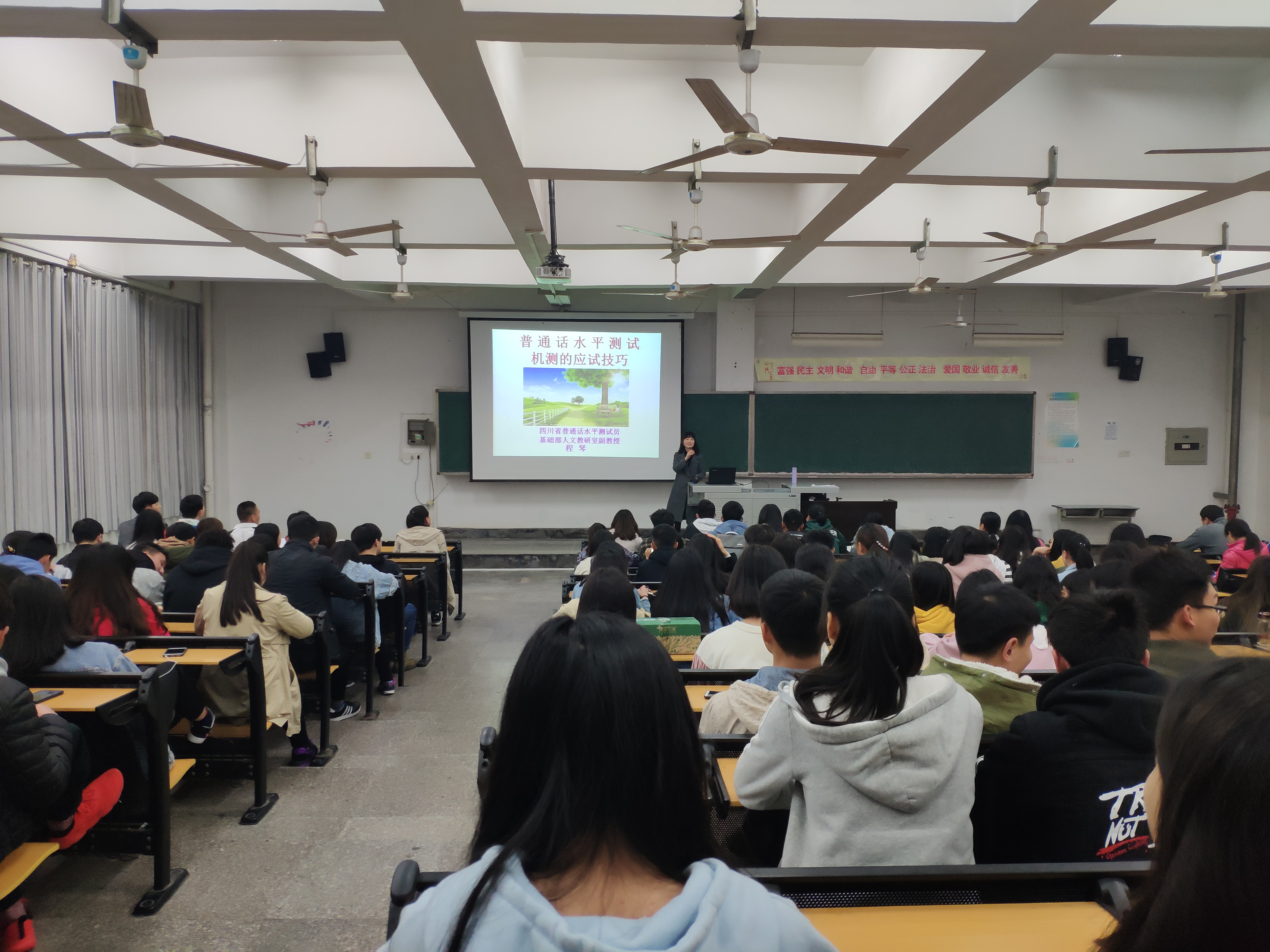 为做好今年的推普活动,并配合3月中旬泸州市语委举办的普通话水平测试,为我院报考普通话水平测试的师生提供一次考前培训,3月13日下午2:40-4:20,基础部安排四川省普通话水平测试员、人文教研室程琴副教授在实A108教室为全院师生举办了一场“普通话水平测试机测的应试技巧”主题讲座。