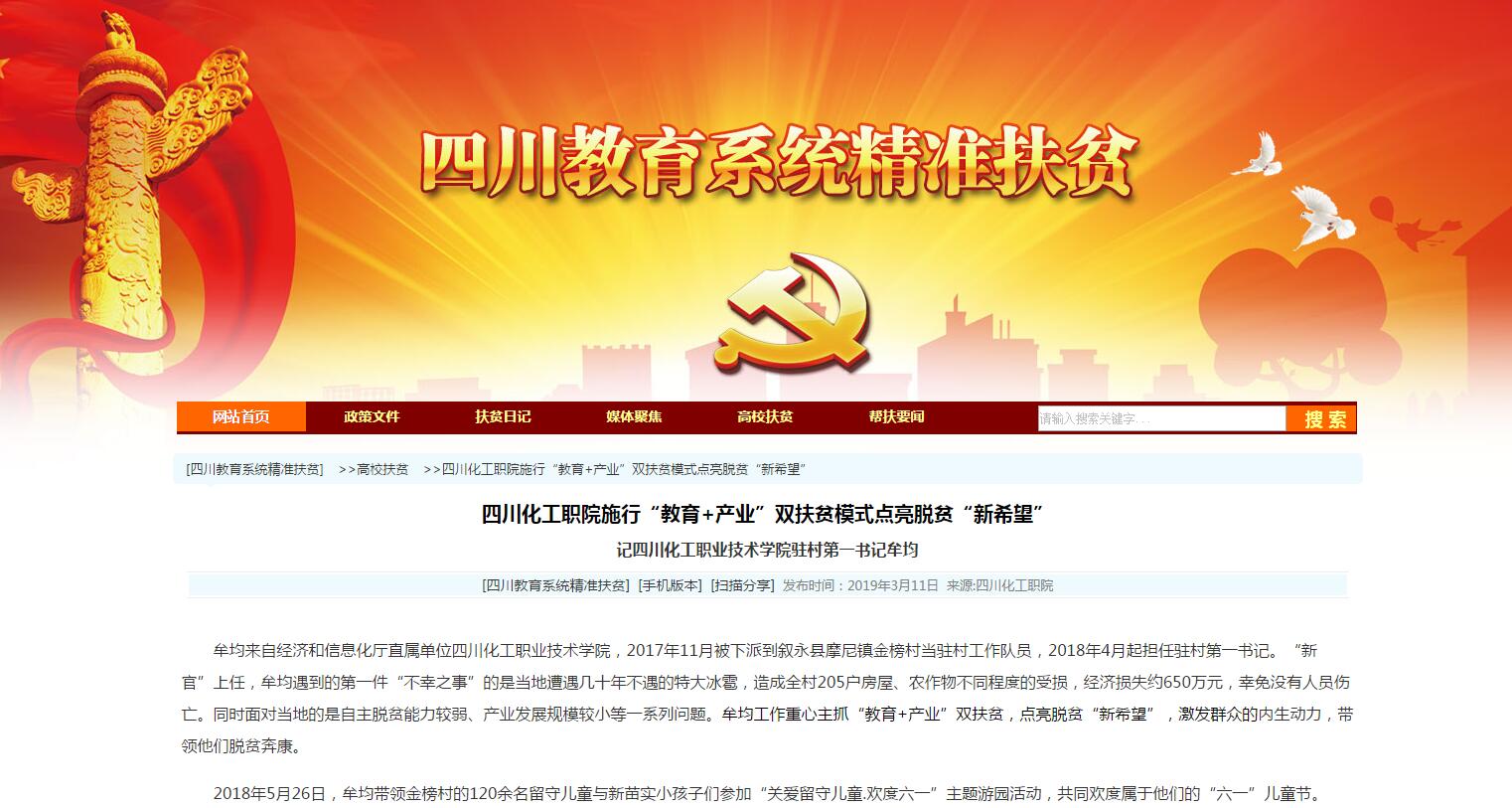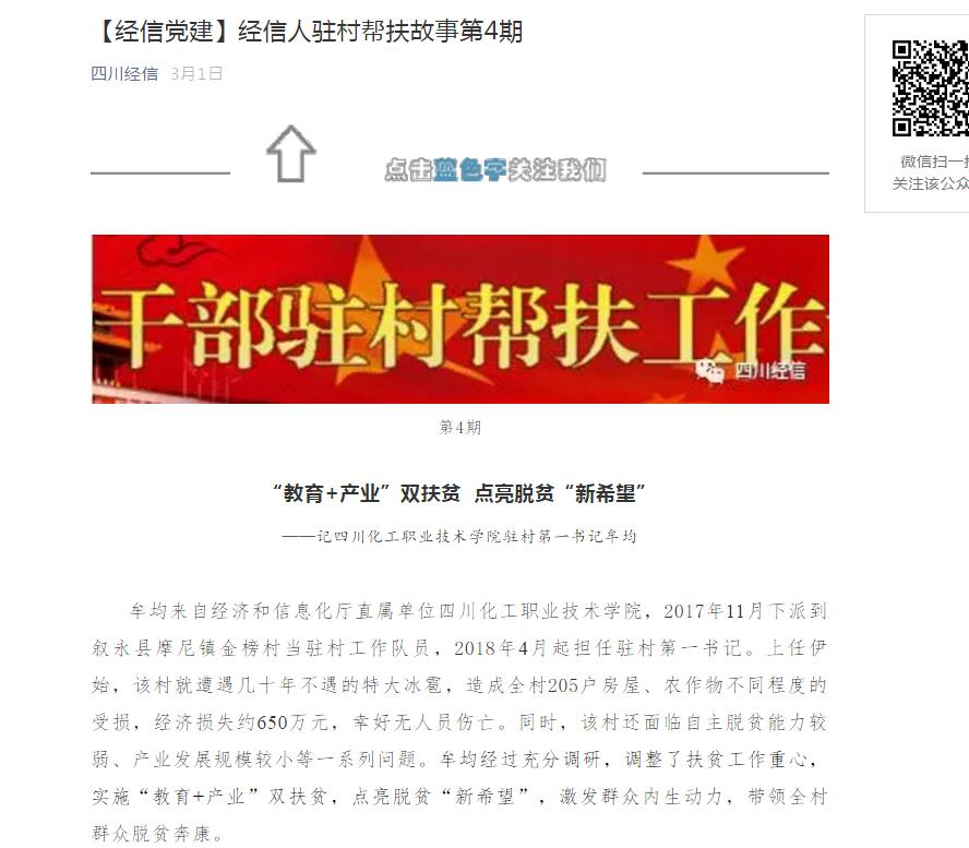 近日,四川教育系统精准扶贫网高校扶贫专栏和四川省经济和信息化厅微信公众号,报道了学院驻村第一书记牟均的驻村事迹,全文报道如下: