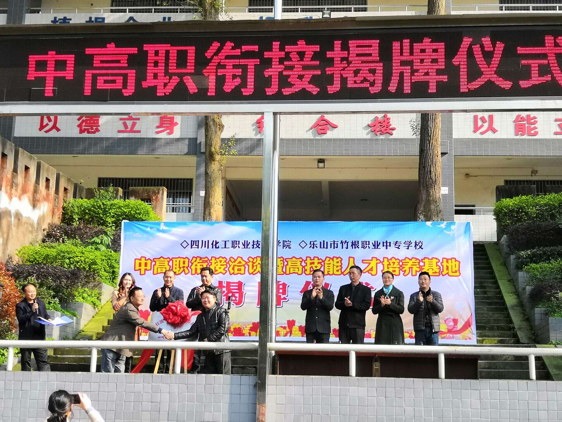 3月11日下午4点,四川化工职业技术学院--乐山市竹根职业中专学校中高职衔接洽谈暨高技能人才培养基地授牌仪式在乐山市竹根职业中专学校举行。乐山五通桥区政府对此次中高职衔接活动高度重视,五通桥区人民政府领导、区教育局领导均莅临参加本次中高职衔接活动。