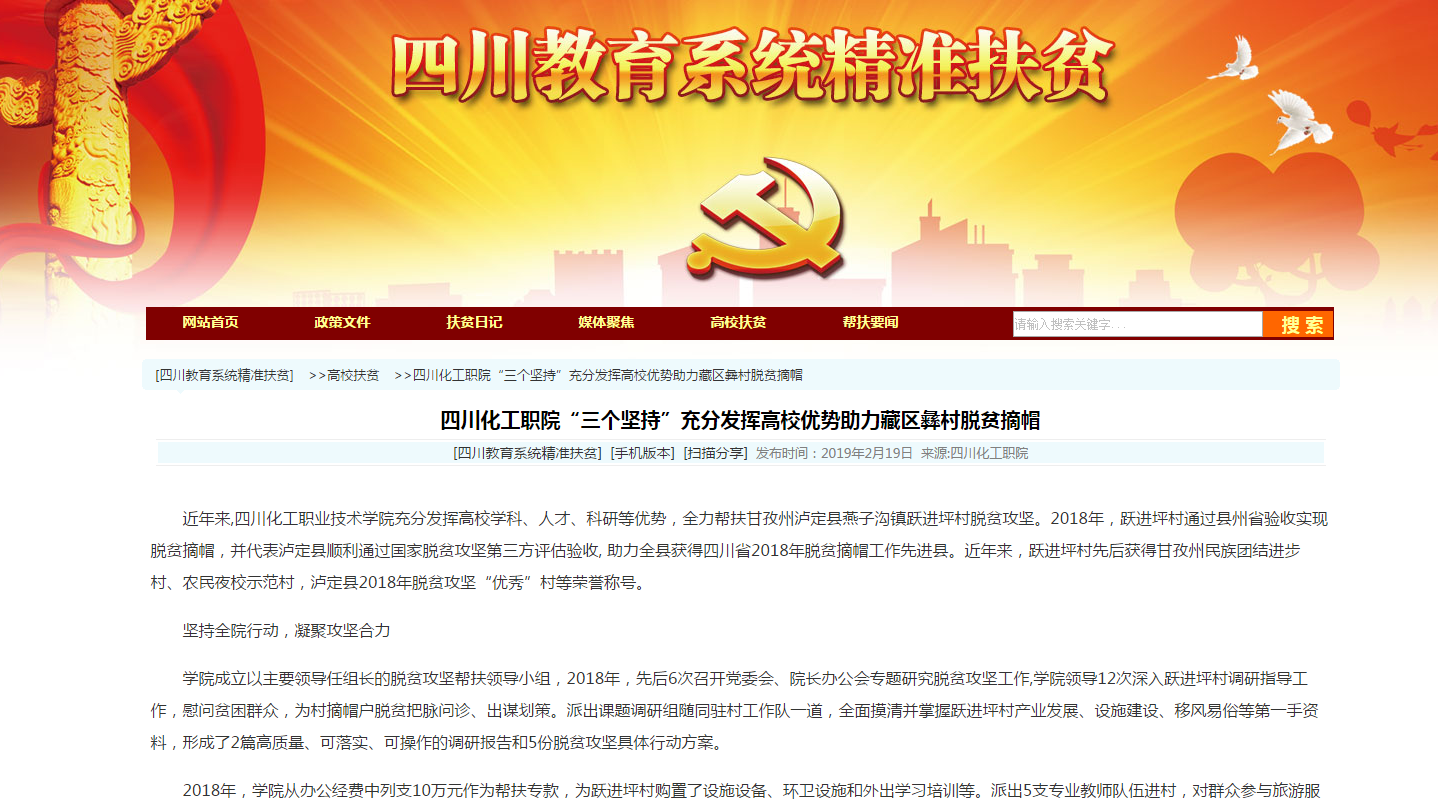 2019年 2月19日,四川省教育厅教育扶贫网以《四川化工职院“三个坚持”充分发挥高校优势助力藏区彝村脱贫摘帽》为题,详细报道了我院充分发挥高校学科、人才、科研等优势,全力帮扶甘孜州泸定县燕子沟镇跃进坪村脱贫攻坚。其中,四川省教育厅网站教育系统精准扶贫专栏开通首期就报道了学院发挥优势助力藏区彝村脱贫摘帽。