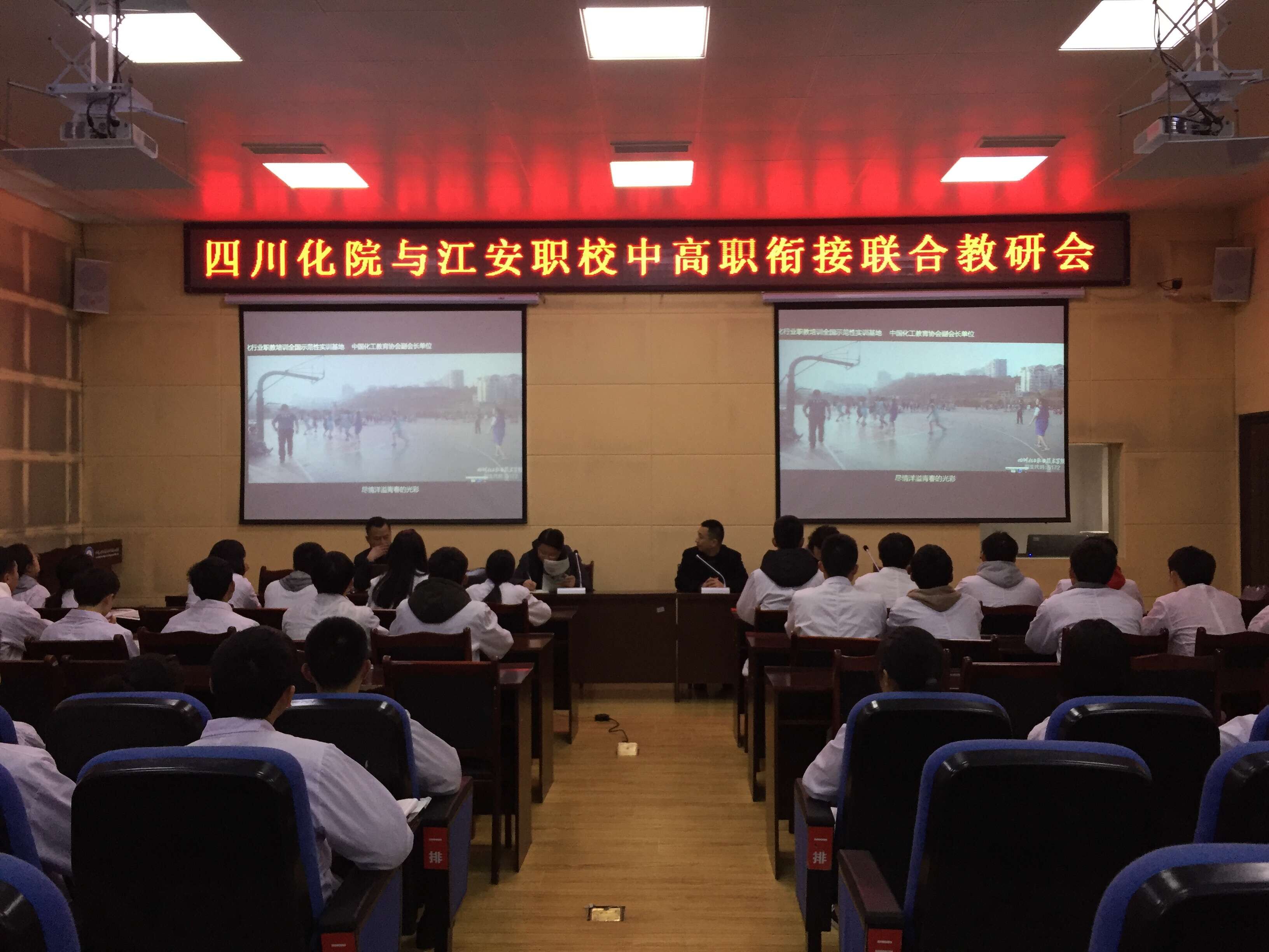 文申柳副院长一行抵达四川省江安县职业技术学校后,在该校学术报告厅与2016级“3+3”工业分析与检验专业衔接班同学举行了座谈交流会。会上,张欣主任对今年化工医药专业大类技能测试大纲进行了解读;罗伦忠处长对学院2019年单招章程、录取方式、就业前景等进行了详细介绍;文申柳副院长为学生们介绍了相关专业的就业前景,订单班及企业优厚的招聘待遇,给学生们描绘了美好的蓝图。此外,文申柳副院长一行还向学生们展示了即将建成的我院新校区效果图。该校谭校长、梁副校长、罗副校长及专业主任和专业教师参加了对接会。梁副校长表示,2016级的“3+3”工业分析与检验专业衔接班自2016年建立以来,双方近20次的互动与精准衔接,即将打通中高职的衔接通道,采撷硕果了,同学们一定要努力学习,要有明确的人生规划,争取以优异成绩顺利升入四川化院深造学习,不辜负江安职校、化院领导、老师的殷切期望。通过本次座谈会的召开,“3+3”工业分析与检验专业衔接班同学们进一步明确了学习方向,树立了学习的信心。