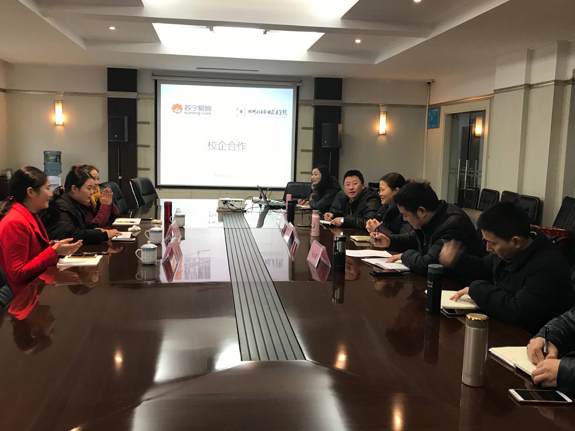 2019年1月9日上午10点,苏宁易购集团股份有限公司内江地区管理中心互联网运营部总经理李玲女士一行来学院开展座谈交流活动,专题商议校企合作项目开发和生产性实训基地共建问题。经济管理系党总支副书记张晋(主持党务工作)、副主任马小洪(主持行政工作)、副主任窦宇及相关专业负责人参加了座谈会,会议由窦宇副主任主持。