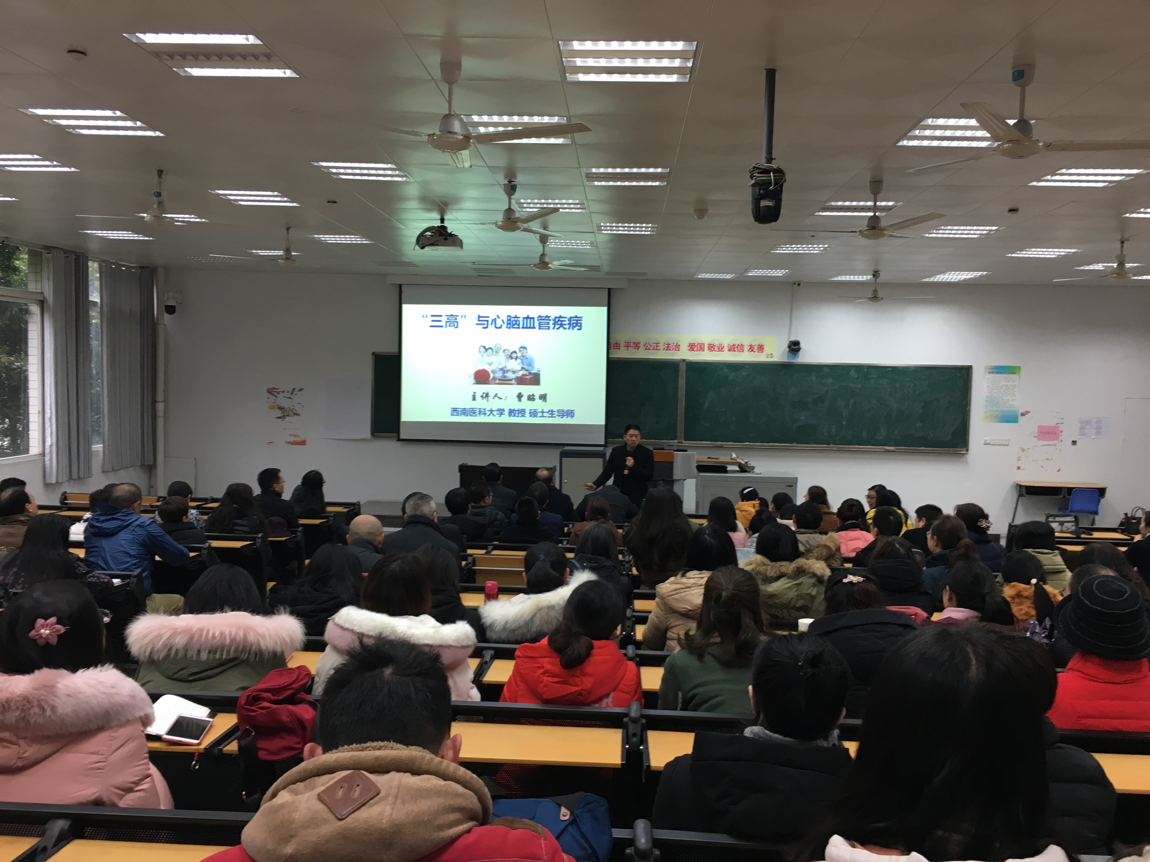 为了进一步提高广大教职工对身体的健康管理水平,让大家及时发现疾病风险并及早控制,增强对健康危险因素的监测、分析、预测、预防的意识。2018年12月14日下午,工会特邀西南医科大学曾昭明、刘杰教授在学院阶梯教室实A208教室,举办题为“家庭健康掌门人”的健康知识讲座。全院共有近百名教职员工现场聆听了讲座。