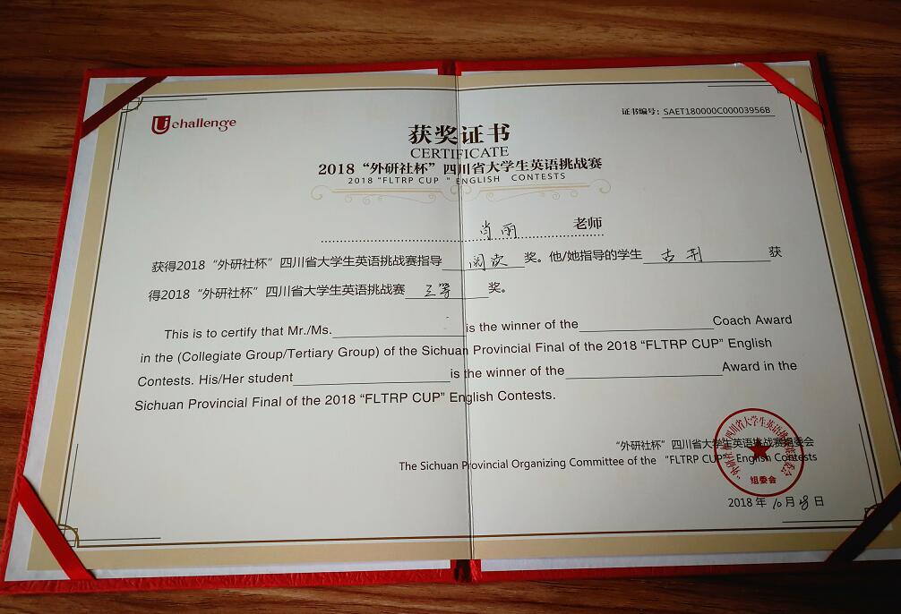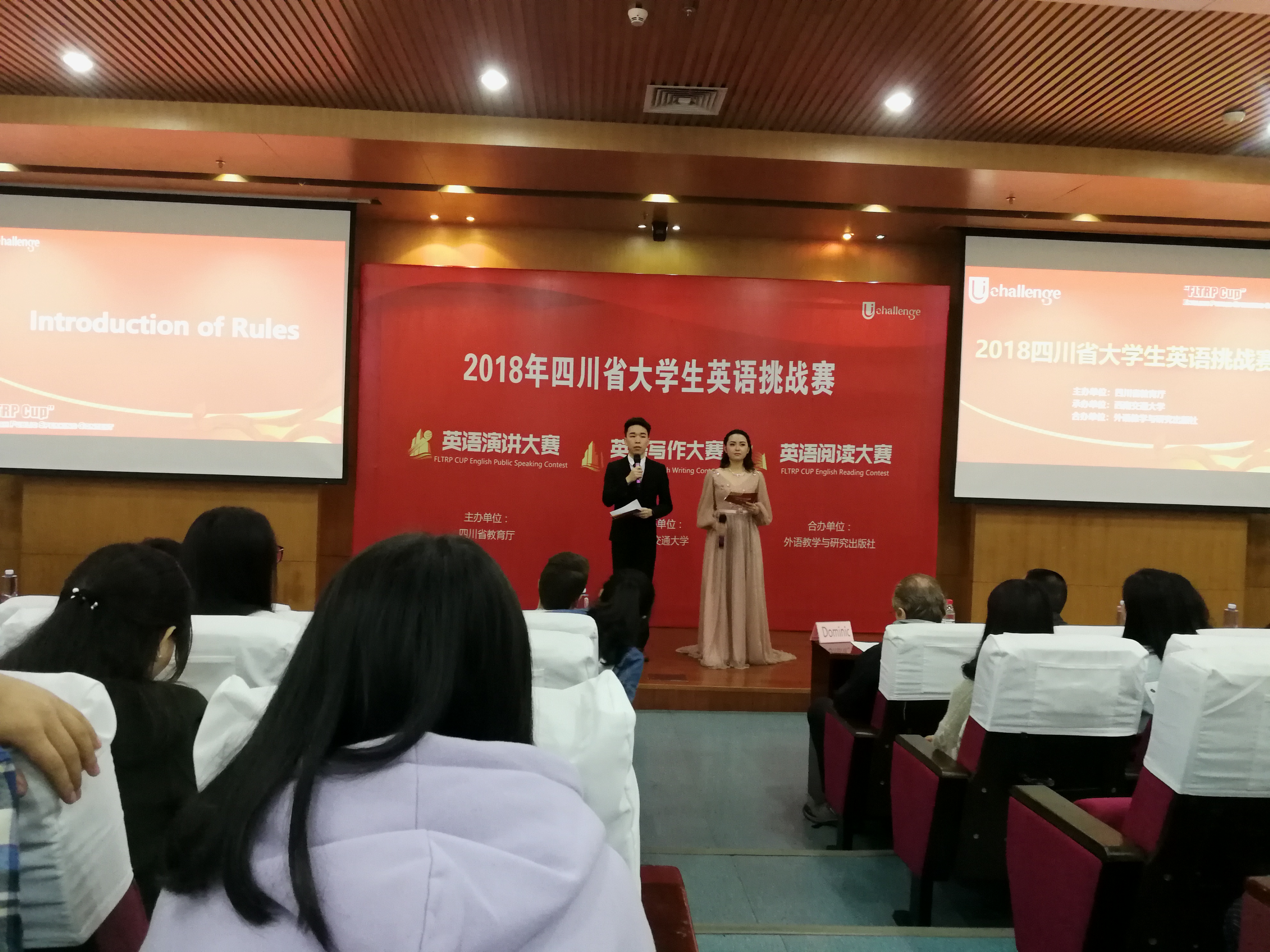 10月28日,由四川省教育厅主办,西南交通大学承办,外语教学与研究出版社合办的2018年四川省大学生英语挑战赛(UChallenge)在西南交通大学犀浦校区举行。为积极参加此次比赛,基础部组织英语教研室全体教师在上学期就进行了院内培训和初赛,选出了两名选手参赛,其中,药品生产1721班赖博文同学代表学院参加演讲比赛决赛,指导老师为罗文华;数字媒体应用技术 1732班的古荆同学代表学院参加阅读和写作比赛决赛,指导老师为肖丽。