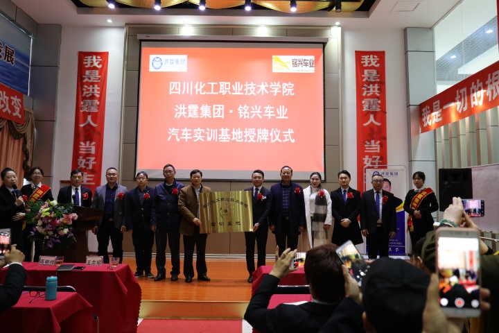 2018年11月7日,学院副院长王志斌带领机械工程系主任高朝祥、副主任任小鸿,质量管理办公室副主任张国勇一行赴洪霆集团泸州市铭兴车业服务有限公司参加我院校外实训基地的揭牌仪式。洪霆集团泸州市铭兴车业服务有限公司董事长李永乾、董事长助理曾朝援、财务副总田梅、常务副总古烨、市场部副总傅世桥、营运副总王道湘、项目副总匡克良及公司职工40余人参加了揭牌仪式。