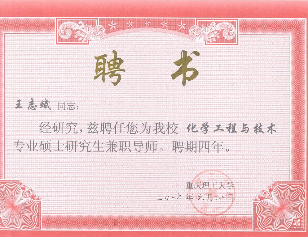 2018年10月18日,重庆理工大学化学化工学院组织召开了“硕导队伍建设研讨会”,我院王志斌教授应邀参加会议并被聘为“化学工程与技术”及“化学工程领域”两个专业的硕士生指导教师,这对增强学院的社会影响力提供了有力支撑。王志斌教授是我院第一个博士、教授、泸州市学术技术带头人、泸州市拔尖人才。
