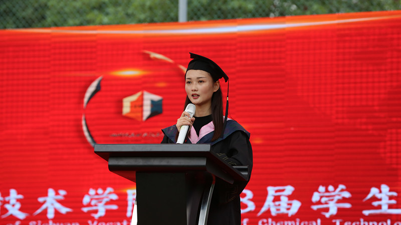 四川省普通高等学校优秀毕业生、应化1532班杨舒淋同学作为毕业生代表发言。她在发言中回忆了自己在化院度过的三年精彩大学时光,表达了自己对母校、对老师以及对家长的感激,并表示作为化院人将继承和弘扬化院人的优良传统,走好自己的人生路。
