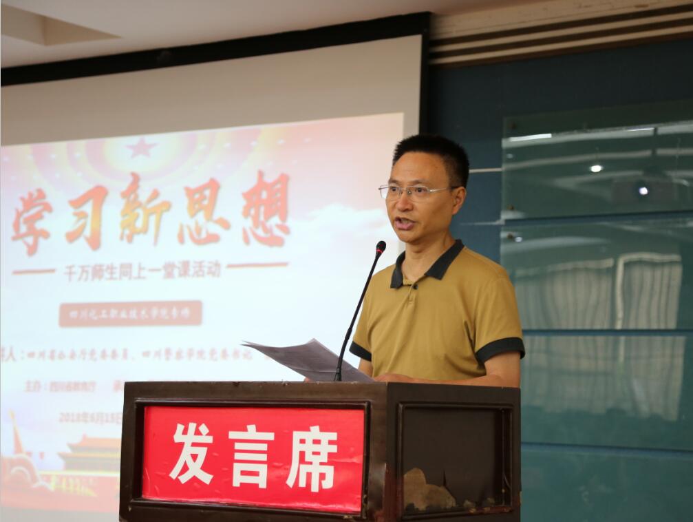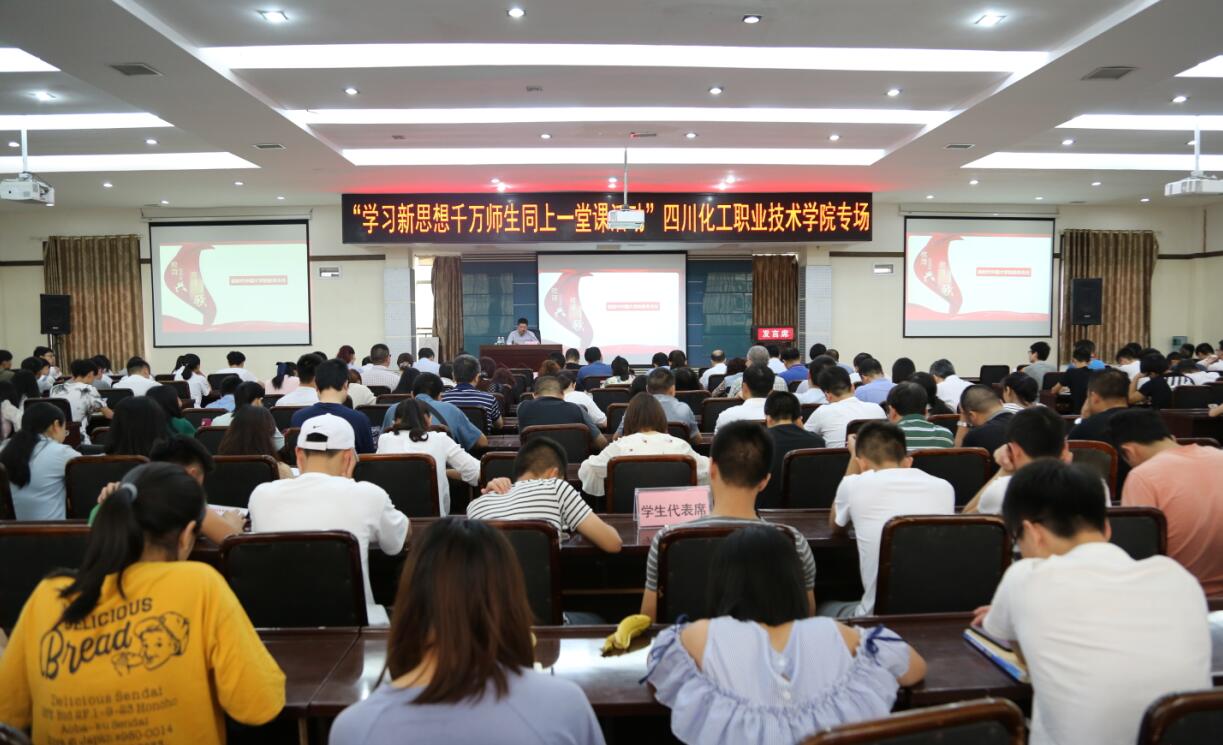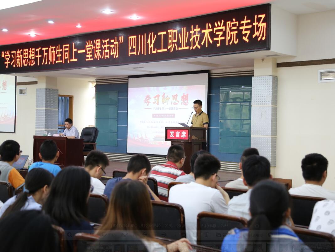 为深入学习宣传贯彻习近平总书记在北京大学师生座谈会和纪念马克思诞辰200周年大会上重要讲话精神,落实《四川省教育厅关于开展“学习新思想千万师生同上一堂课活动”的通知》(川教函〔2018〕302号)精神,6月15日上午,由四川省教育厅主办,四川警察学院和四川化工职业技术学院共同承办的“学习新思想千万师生同上一堂课活动” 四川化工职业技术学院专场在行政楼五楼会议室举行。四川高校学习“习近平总书记重要讲话精神讲师团”成员、四川省公安厅党委委员、四川警察学院党委书记张光华作了题为《坚定理想信念,担当时代重任——做新时代中国特色社会主义的接班人和建设者》的主题讲座。学院党委副书记(主持党委工作)、院长杨宗伟,副院长蒲开伦、文申柳,各系(部)相关负责人和学生代表近300人聆听了报告会。报告会由学院党委副书记(主持党委工作)、院长杨宗伟主持。