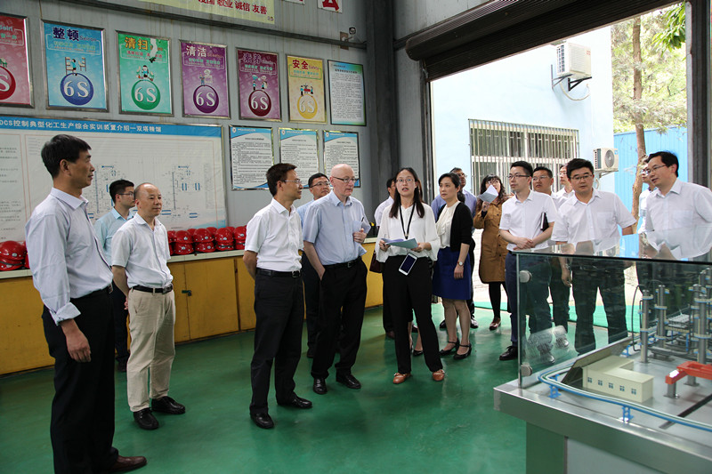 考察中,杨院长带领安迪·吉布森一行参观了机械工程实训中心、高分子材料工程中心、化工DCS、橡胶材料中心等实验室,杨院长向安迪·吉布森介绍了注塑机、高通量微通道连续流反应器、气质联用仪等设备的功能及已开展的实训项目与科研设想,展示了学生加工的部分产品,并与安迪·吉布森进行深入的讨论和交流。