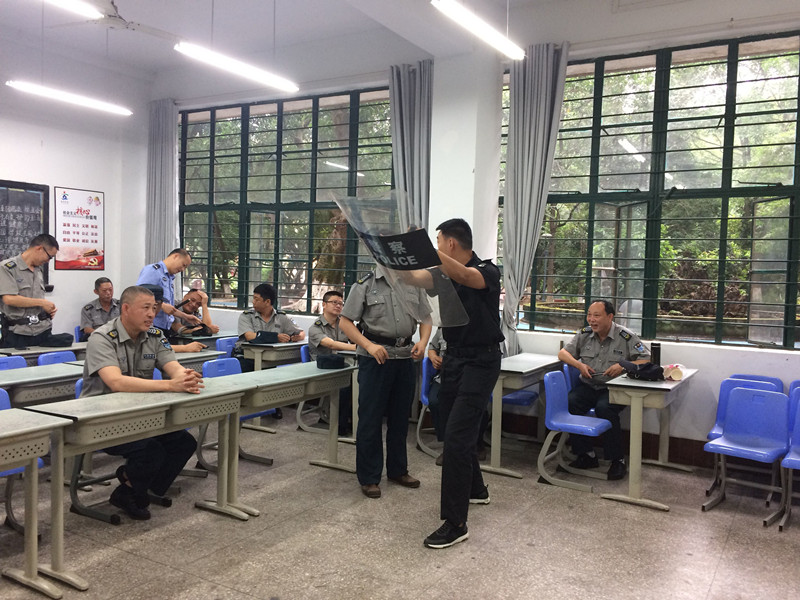护校队队长姚继对保安人员开展了防暴应急处置培训,现场讲解了防暴盾牌、齐眉棍、钢叉、抓捕器等防爆器材的作用和正确执用手法;演示各器材的使用方法和使用技巧。