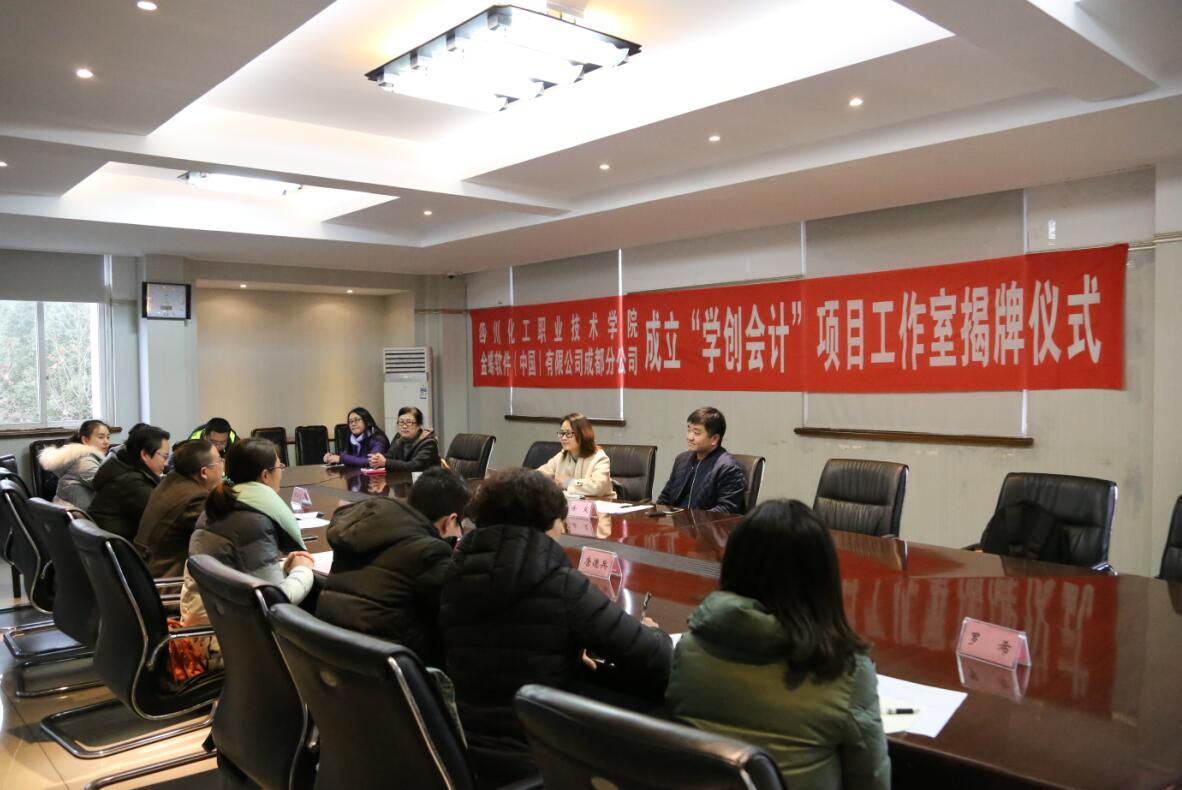 1月29日下午,四川化工职业技术学院引入金蝶公司成都分公司成立“学创会计”项目工作室揭牌仪式在行政楼三楼会议顺利举行。院长助理邓启华、教务处副处长袁晓东、经管系张晋副主任、经管系唐德兵主任助理及专业科老师代表出席了揭牌仪式。仪式由经管系副主任张晋主持。