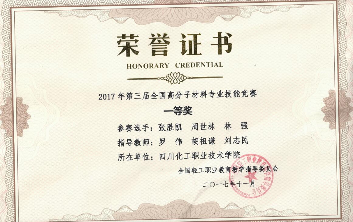 2017年11月15日至17日,第三届全国高分子材料专业技能竞赛在常州隆重举行。本次竞赛由全国轻工职业教育教学指导委员会主办,全国轻工行指委塑料成型专业指导委员会、常州轻工职业技术学院联合承办。来自全国各高职院校的100余名师生参加了此次比赛。我院化学工程系高分子专业学生周世林、张胜凯、林强组成的代表队荣获 “团体一等奖”,林强同学荣获“个人全能一等奖”。