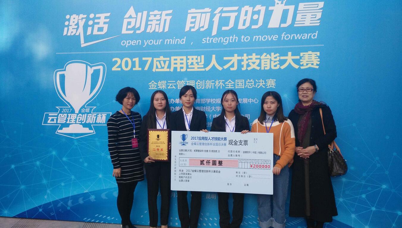 2017年11月12日,全国“应用型人才技能大赛金蝶云管理创新杯”总决赛在云南财经大学落下帷幕。本次大赛由教育部学校规划建设发展中心主办,云南财经大学、金蝶软件(中国)有限公司承办。该项赛事自今年6月份启动以来,全国共有300所高校1210支队伍参赛,分为12个省区赛,其中有88支队伍晋级全国总决赛,最后分为本科组和高职组各争夺1个一等奖,4个二等奖。总决赛由中央电视台全程跟踪报道。我院会计专业学生王定婧、李英、吴玥平、胡晓兰组成的川化院队通过云管理应用赛和云管理财报赛两个比赛环节,最终获得进入总决赛争夺赛进行巅峰对决的资格,经过必答、抢答、才艺展示后喜获高职组二等奖。