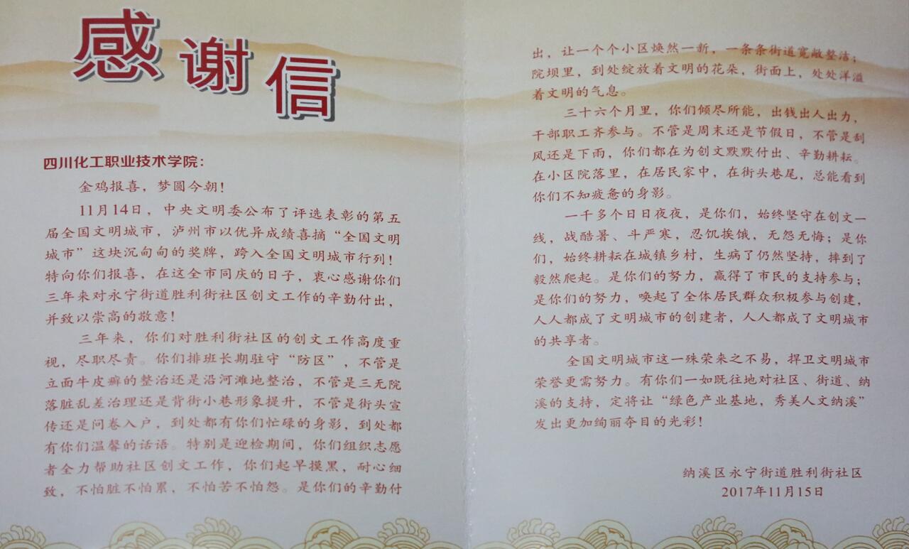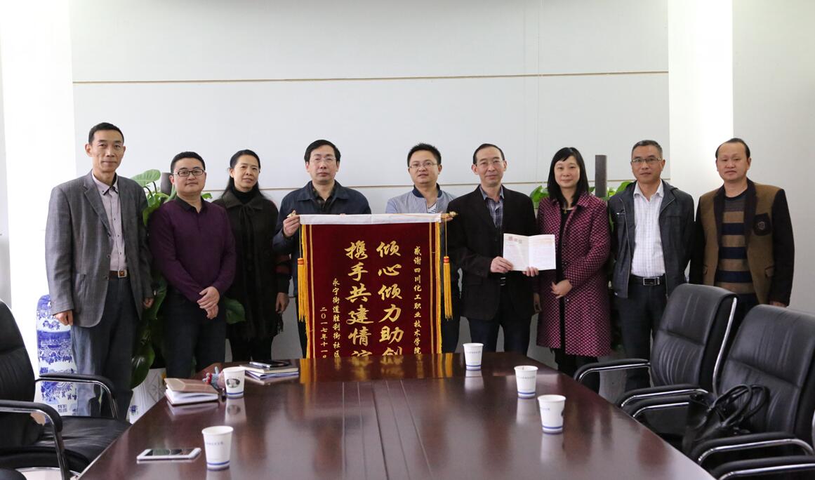 11月14日,中央文明委公布了评选表彰的第五届全国文明城市名单,泸州以优异的成绩喜摘“全国文明城市”这块沉甸甸的奖牌,跨入全国文明城市行列,用泸州精神创造了泸州奇迹。11月16日上午,纳溪区永宁街道办事处副主任张雪松带领胜利街社区干部来到我院,送上了社区的感谢信和一面绣着“倾心倾力助创文,携手共建情谊深”的锦旗,对我院在“创文”工作的辛勤付出表示感谢。学院苏建智副院长、党委办公室、后勤服务处相关人员参加了座谈会。