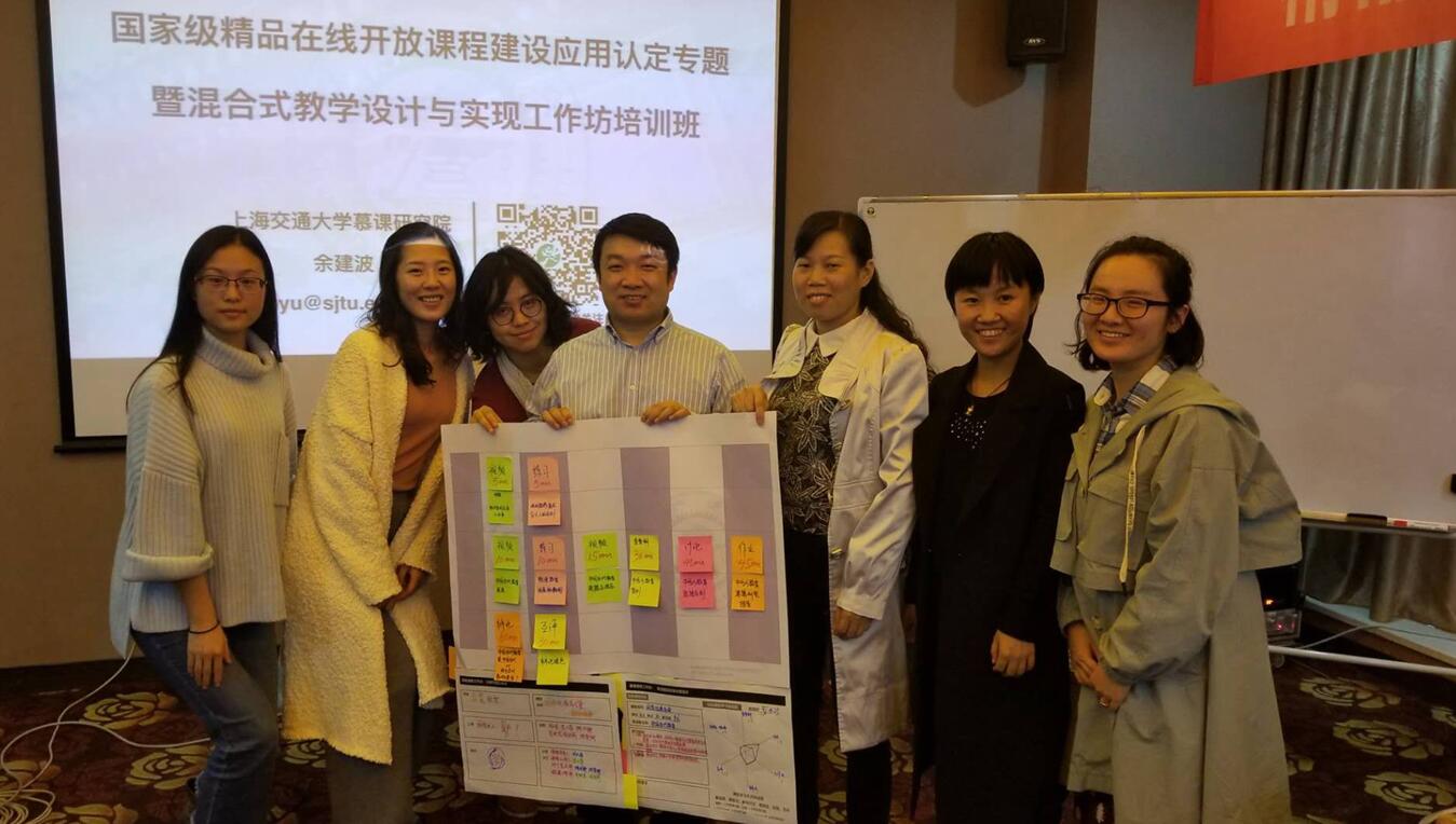 此次培训班为期四天,采用“工作坊”分组培训形式,培训内容为“国家级精品在线开放课程建设应用及认定专题暨混合式教学设计与实现”。主讲老师为上海交通大学教务处在线课程负责人、上海交通大学首批慕课课程建设推进办公室负责人余建波老师。