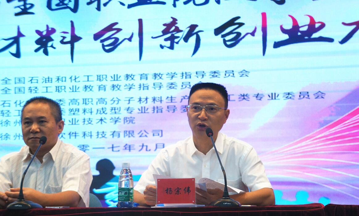 2017年9月21日至22日,第一届全国职业院校学生高分子材料创新创业大赛决赛在江苏徐州隆重开幕。本次大赛由全国石油和化工职业教育教学指导委员会和全国轻工职业教育教学指导委员会联合主办,高职高分子材料生产及加工类专业委员会和徐州工业职业技术学院承办。中国化工教育协会于红军秘书长,高职高分子材料生产及加工类专业委员会主任、学院杨宗伟院长,广东轻工职业技术学院王玫瑰院长,四川橡胶工业协会杨涟秘书长,江苏橡胶工业协会聂恒凯秘书长,徐州工业职业技术学院等学校、企业领导和评审专家共30余人参加了开幕式和闭幕式。学院杨宗伟院长主持大赛开幕式和闭幕式。