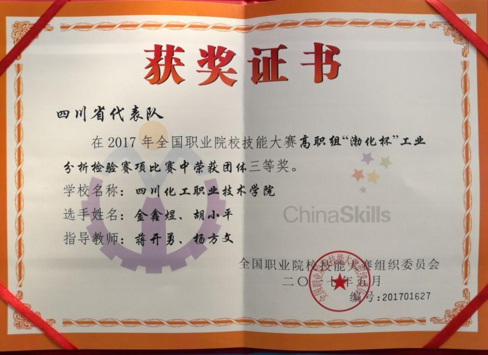 我院制药与环境工程系工业分析与检验专业学生金鑫煜、胡小平代表四川省高职院校参加理论与仿真考核、化学分析和仪器分析三个赛项单元考核,两位同学以扎实的理论基础、凭借精湛的操作技能及坚忍不拔的毅力和良好的团队精神风貌,经过三天的激烈角逐,最终我院代表队喜获团体三等奖。