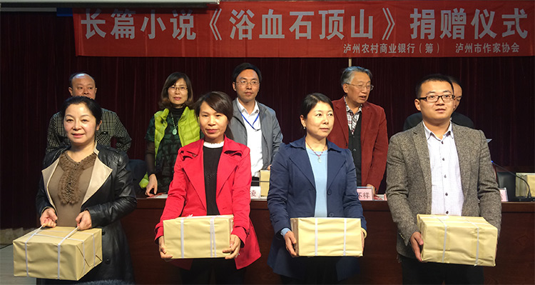 为纪念中国工农红军长征胜利80周年, 10月28日,由泸州农商银行(筹)、泸州市作家协会联合主办的《泸州作家》纪念红军长征胜利80周年专号——长篇小说《浴血石顶山》捐赠仪式在泸州市图书馆三楼会议室隆重举行。我院图书馆陈涛同志代表学院参加了捐赠仪式并获赠24册图书。