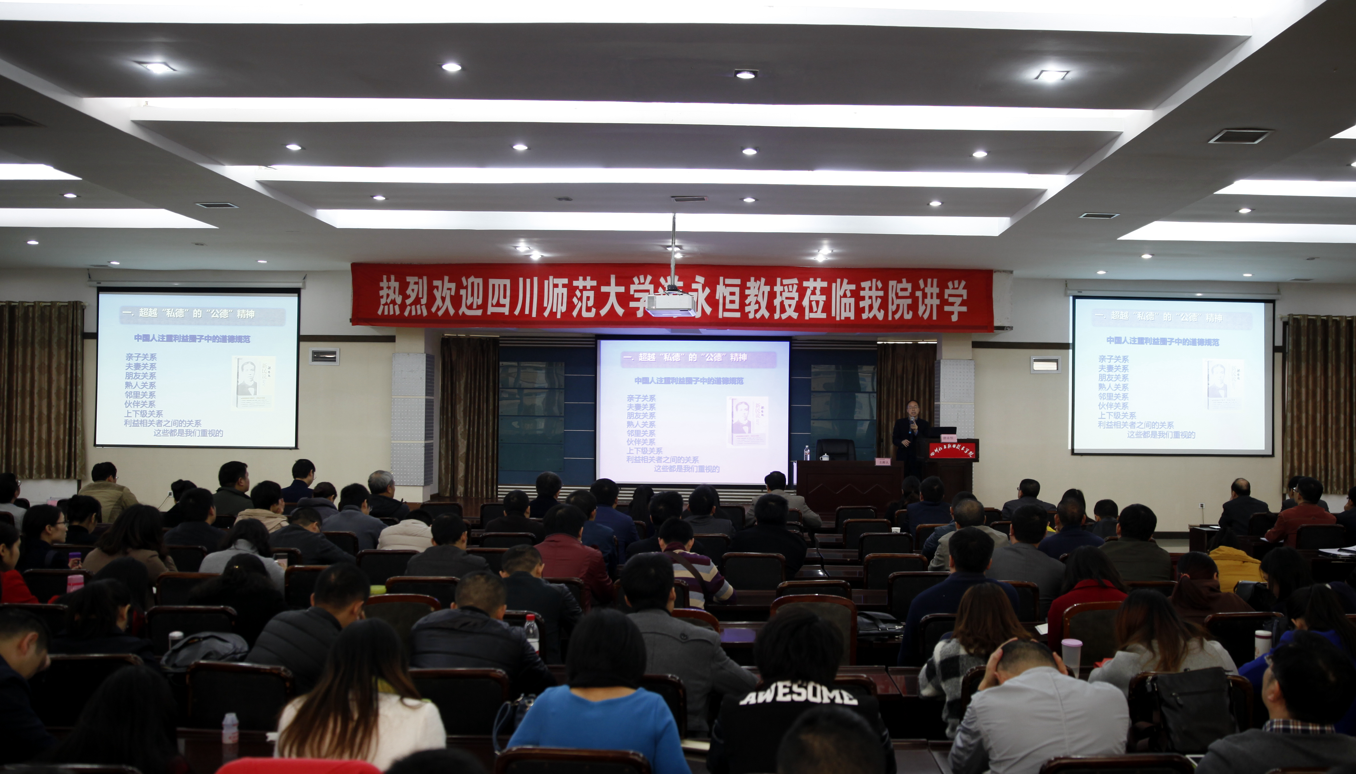 11月25日下午,四川师范大学游永恒教授莅临我院作了题为《教师伦理精神和道德》的专题讲座。学院副院长王志斌、党委副书记陈淑娟及全体专、兼职教师参会。会议由院长助理邓启华主持。