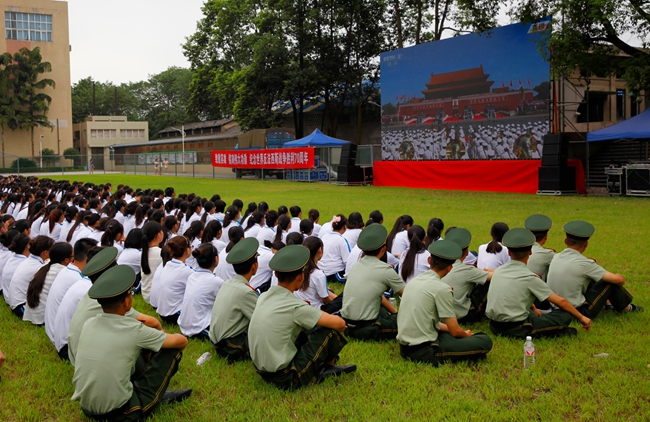在教官的带领下,同学们席地而坐,专心致志的观看纪念大会。在习近平总书记的重要讲话、检阅部队、分列式等过程中,现场不时爆发出热烈的掌声和由衷的赞叹声,表现出对祖国强大军队实力的敬佩之情和油然而生的自豪感。在升国旗时,全场师生更是集体起立,高唱国歌,用饱满的热情和高亢的歌声表达了他们对抗战老兵崇高的敬意和对祖国的热爱。