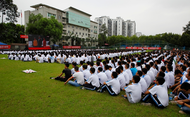 9月3日,纪念中国人民抗日战争暨世界反法西斯战争胜利70周年大会暨阅兵仪式在北京隆重举行,为教育大学新生铭记历史、缅怀先烈、珍爱和平,学院组织2015级全体新生在足球场观看了这一盛况。
