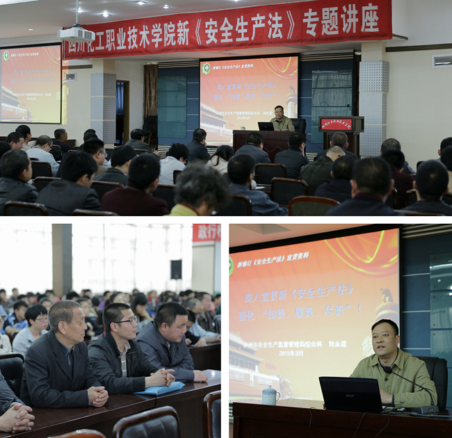 《中华人民共和国安全生产法》(修正版2014)于2014年12月1日起正式施行,为加强师生对新《安全生产法》的理解,在全国第20个安全教育日前夕,3月27日下午,学院保卫处和法规室特别邀请了泸州市安全生产监督管理局综合科刘永建科长在行政楼五楼举办新《安全生产法》专题讲座。学院教学实验实训、学管后勤的教职工和学生代表共计200余人参加了讲座。